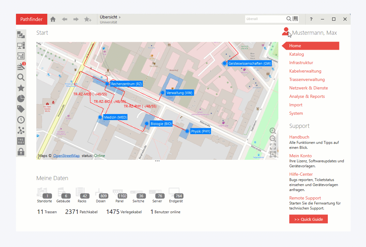 Geben Sie auf dem Anmeldungsfenster Benutzernamen und Passwort ein und bestätigen Sie die Eingabe. Pathfinder lädt nun Ihre Daten und öffnet das Hauptfenster. Das Standardpasswort für die Teststellung ist “admin”.