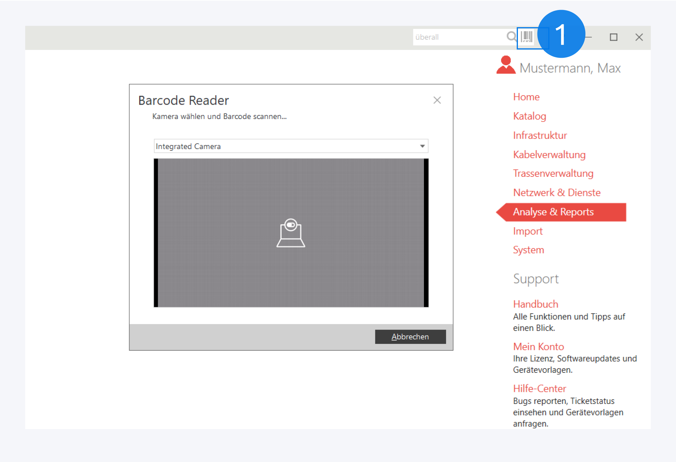 Klicken Sie auf das Scan-Icon (1), um den Barcodeleser zu öffnen. Wählen Sie die gewünschte Kamera aus.