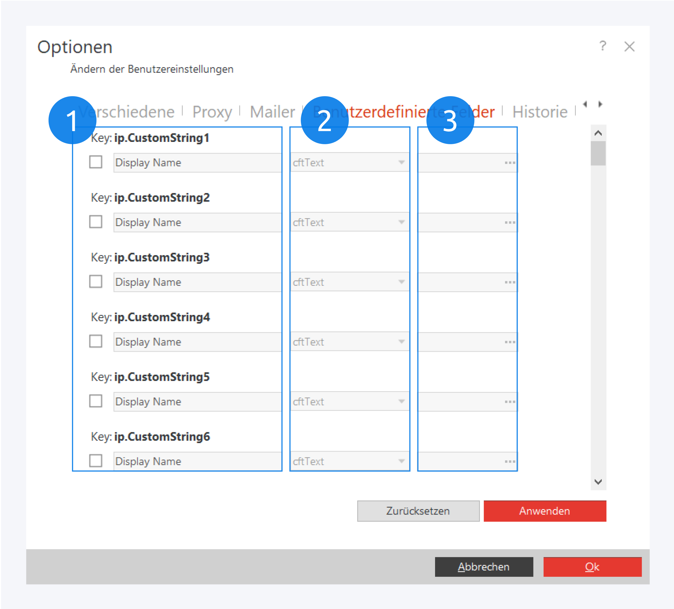 Aktivieren Sie zunächst ein Feld, indem Sie den entsprechenden Haken setzen und geben Sie dem Feld den gewünschten Anzeigenamen (1).