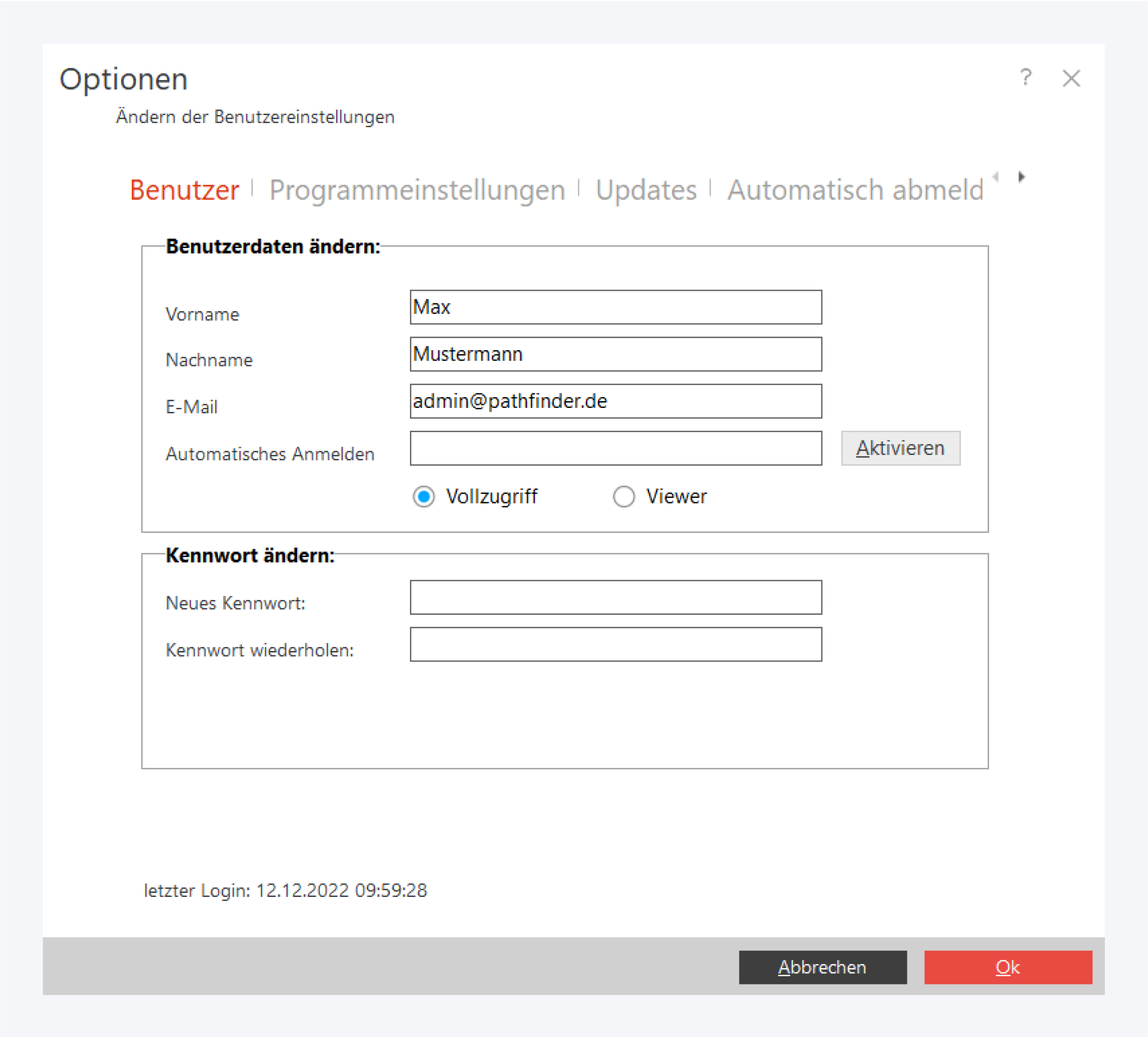 Der Benutzername hingegen kann nur durch einen Administrator in der Benutzerverwaltung angepasst werden.