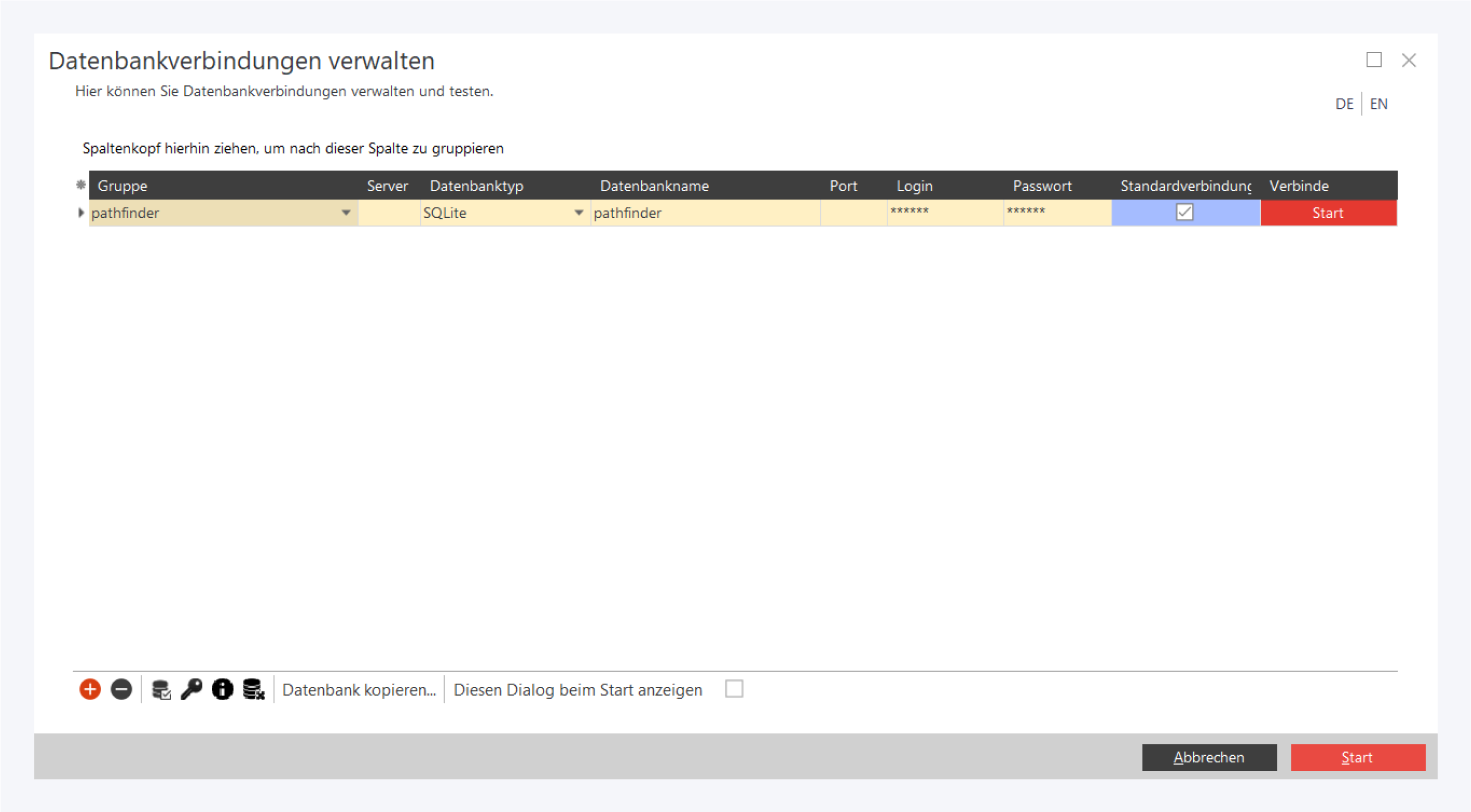 Wenn Sie regelmäßig mit verschiedenen Datenbanken arbeiten, empfehlen wir Ihnen "Diesen Dialog beim Start anzeigen" zu aktivieren.