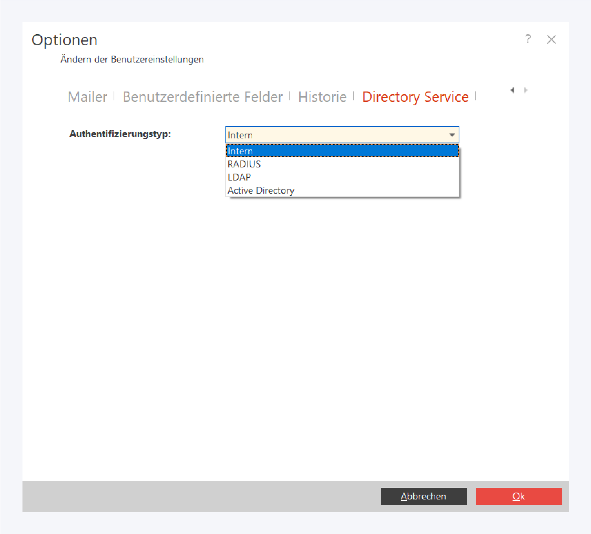 Hier können Administratoren die Authentifizierungstypen verwalten. Die folgenden Möglichkeiten stehen zur Verfügung: