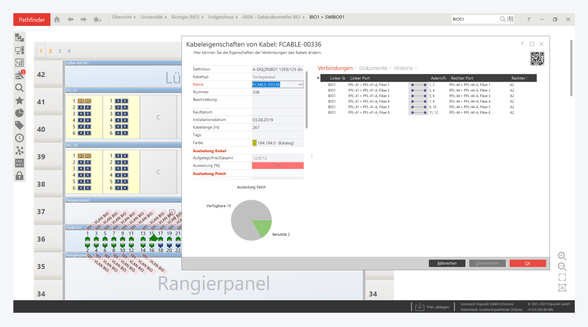 Oder Sie öffnen die Eigenschaften eines Primärkabels, hier im Beispiel FCABLE-00336 und hinterlegen die Kabellänge. Leiten Sie über den Reiter Verbindungen auf Ader-/Faserebene ab, ob diese aufgelegt, mit einem Leitungstyp vorbereitet oder frei sind.