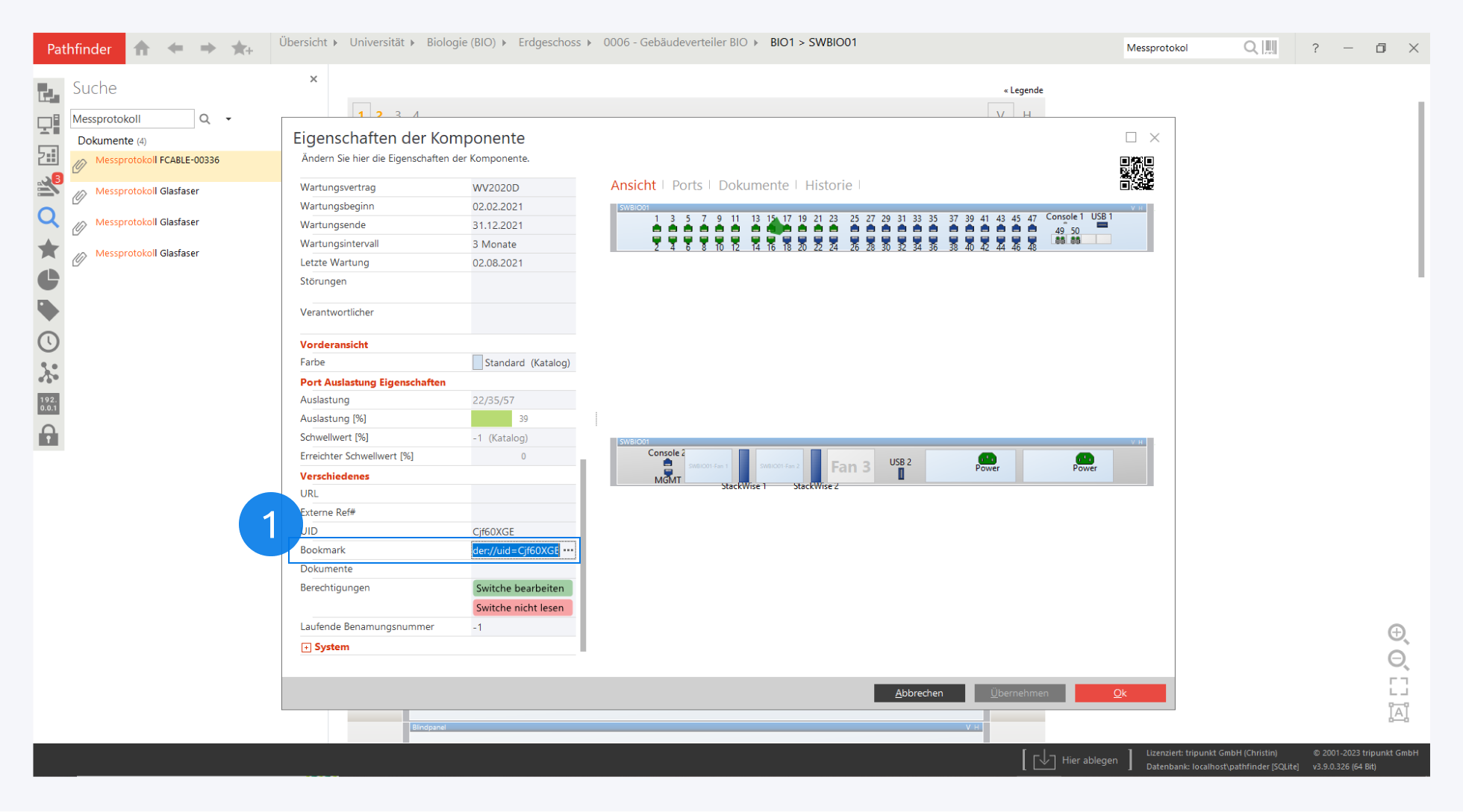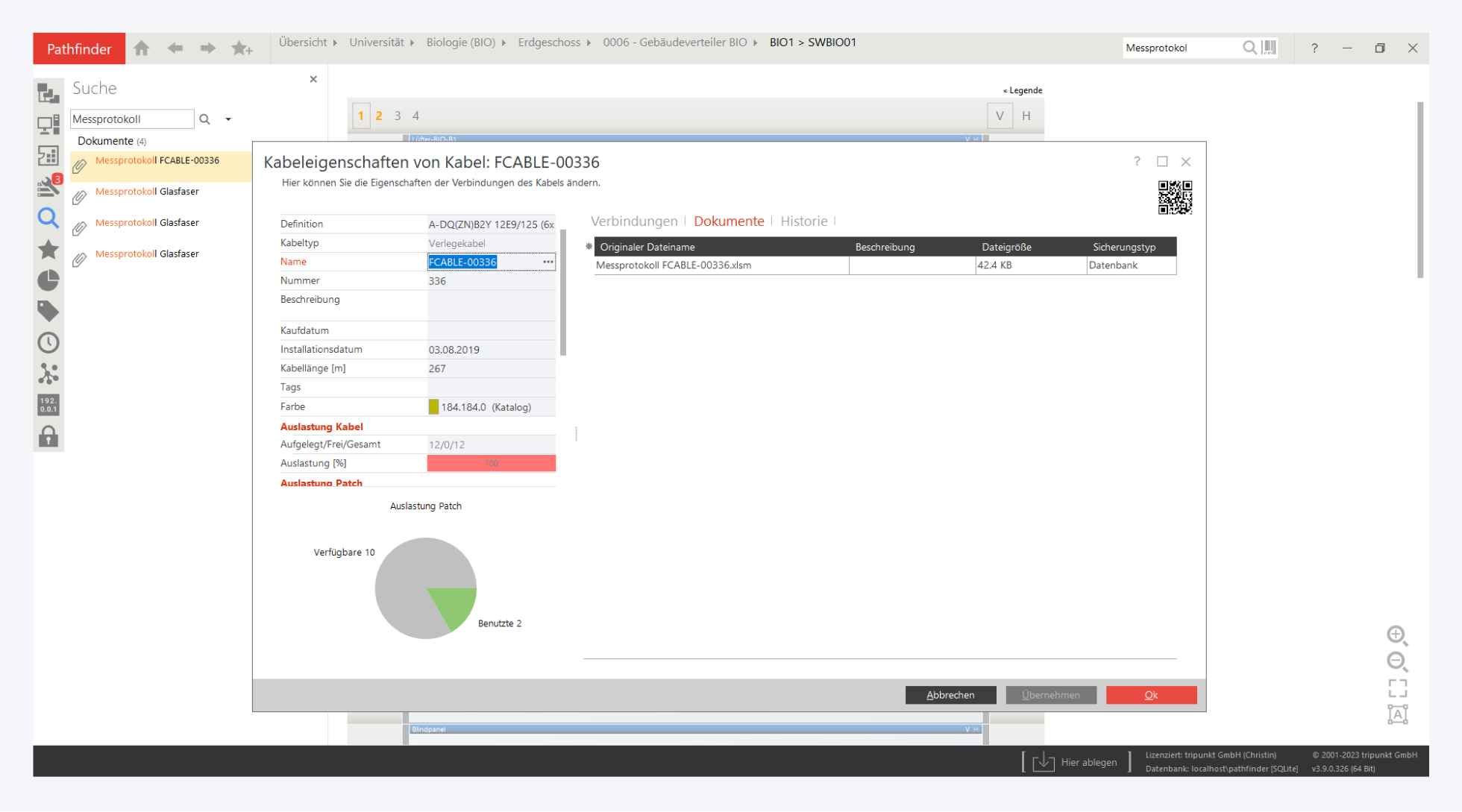 Pathfinder bietet die Möglichkeit, zu allen IT-Assets und Kabeln weiterführende Informationen zu hinterlegen, anzuzeigen oder zu bearbeiten. Diese zusätzlichen Eigenschaften können Sie an jedem beliebigen Objekt in der Datenbank, wie zum Beispiel an einer Trasse oder einem Standort hinterlegen und auch im Reporting ausgeben lassen.