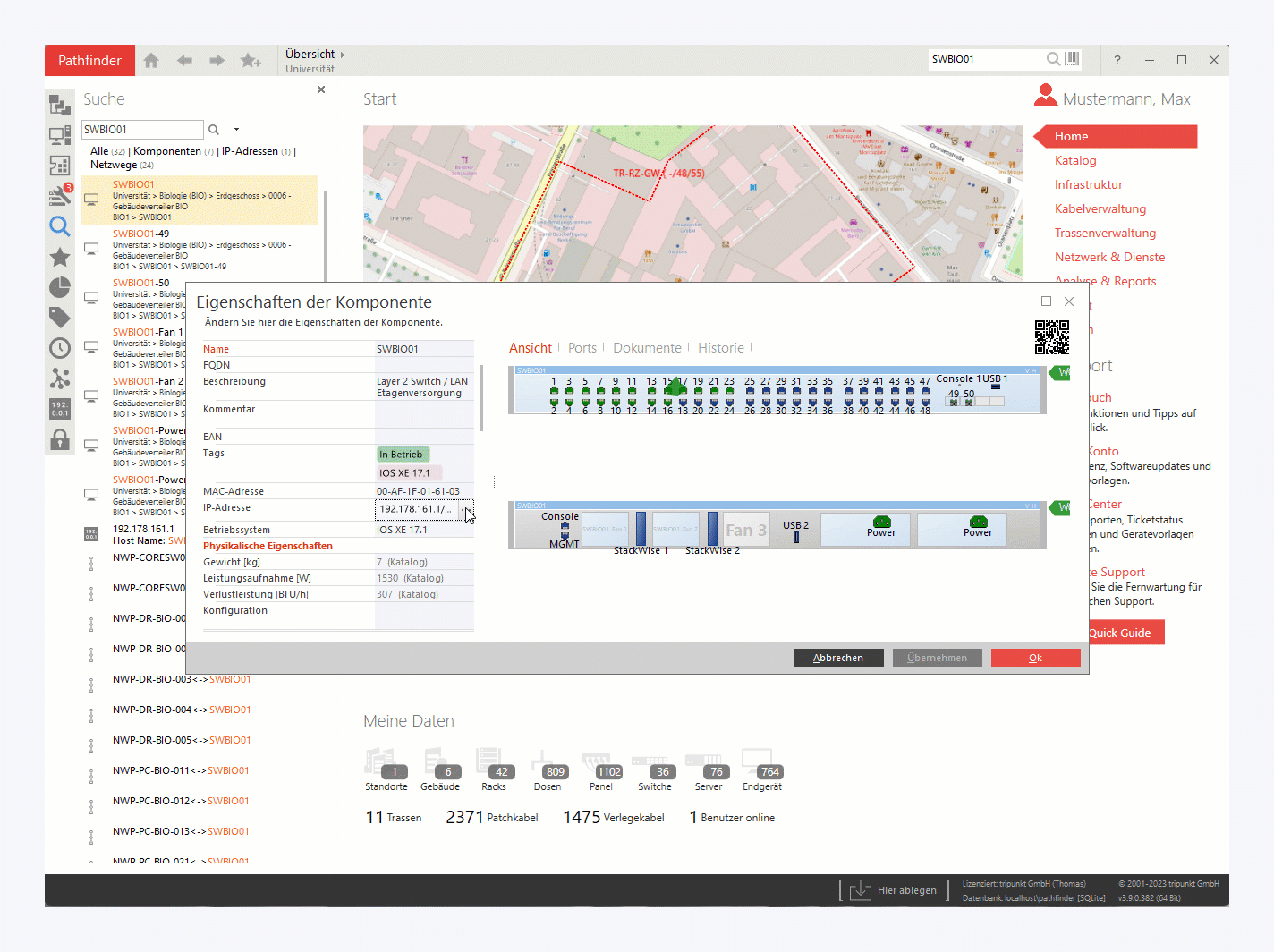 Probieren Sie es einfach aus. Nutzen Sie die Suche in der Sidebar oder klicken Sie auf den Switch SWBIO01 und öffnen über das Kontextmenü den Eigenschaften-Dialog. Weisen Sie zum Beispiel eine IP-Adresse zu oder hinterlegen Sie eine Seriennummer.