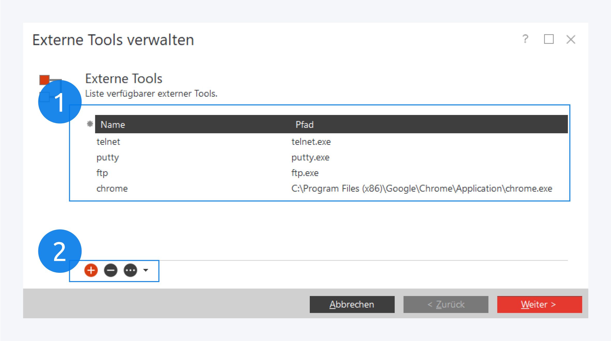 Sie können weitere Tools hinzufügen oder bestehende löschen (2).