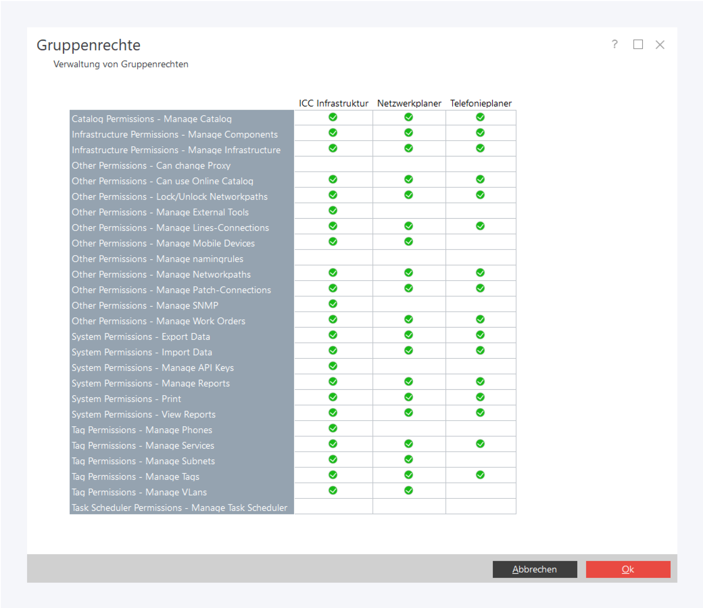 Hier können für jede Gruppe individuell Zugriffsrechte für die einzelnen Funktionen gewährt werden. Für manche Funktionen ist eine Kombination mehrerer Zugriffsrechte nötig (siehe unten).