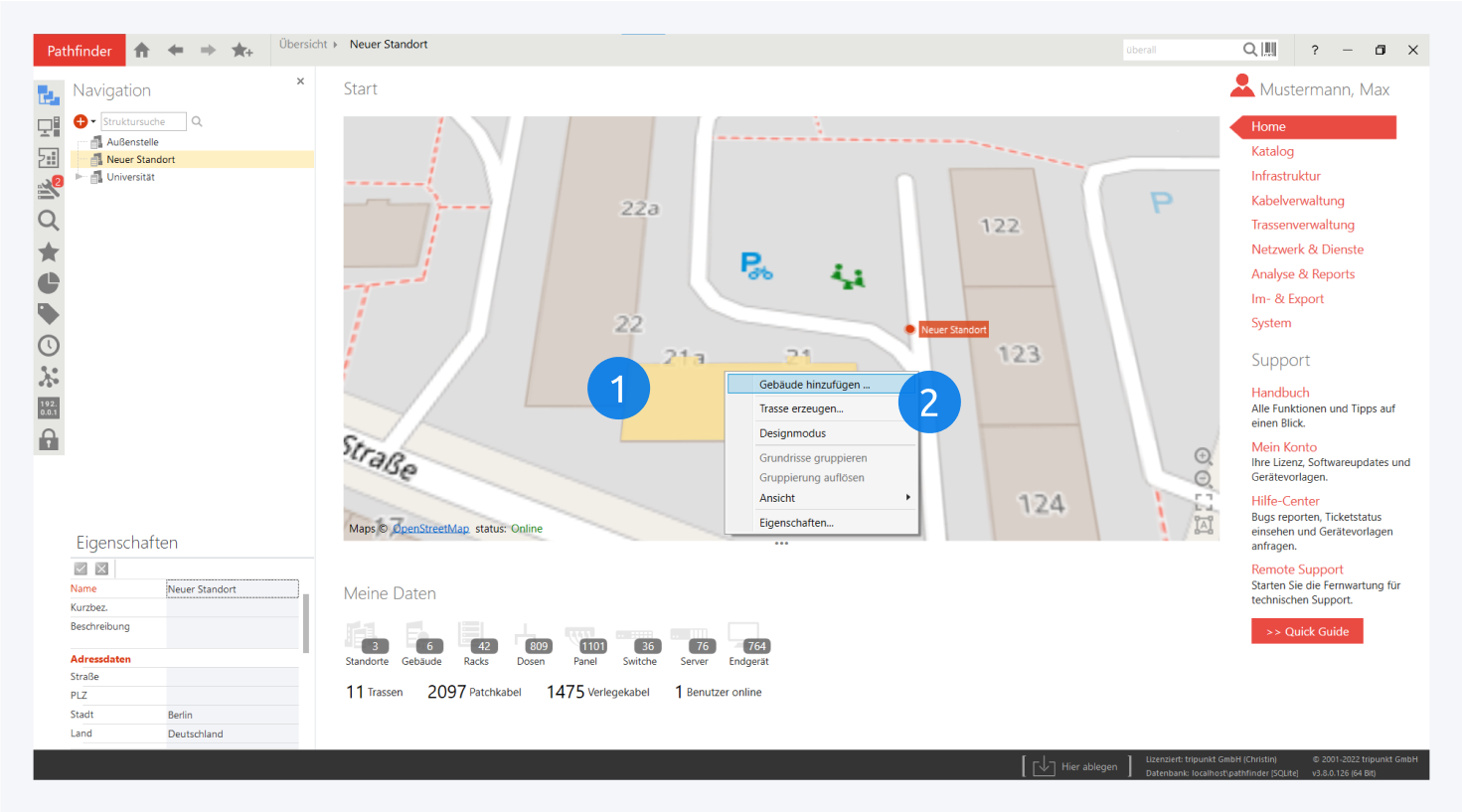 Um ein neues Gebäude anzulegen, öffnen Sie den Navigationstab. Klicken Sie anschließend auf das Plus-Icon und wählen Sie Gebäude aus. Alternativ wählen Sie auf der Karte ein Gebäude per Rechtsklick aus (1) und klicken im Kontextmenü auf Gebäude hinzufügen (2).