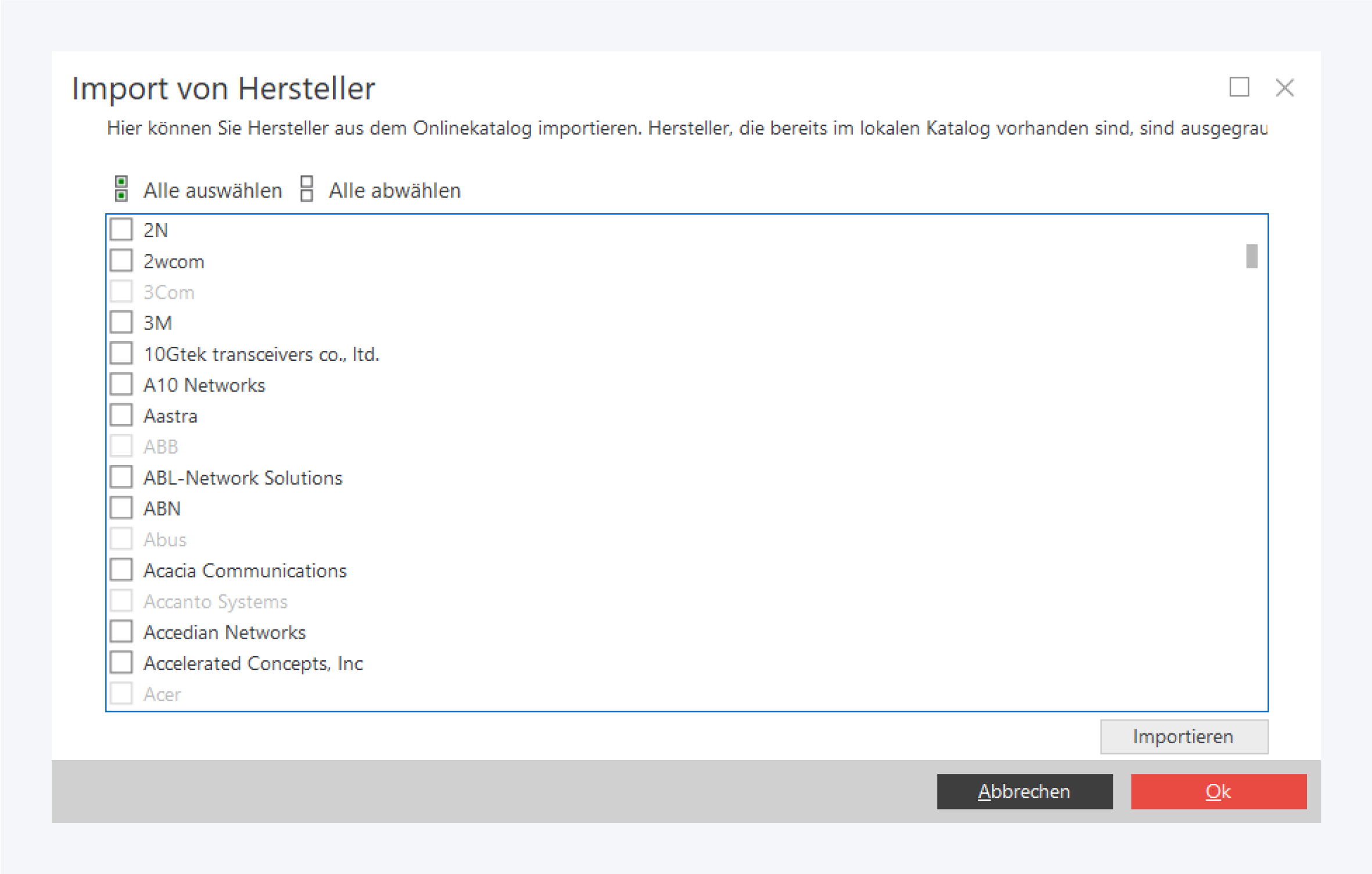 Hersteller, die bereits in den lokalen Katalog importiert wurden, werden ausgegraut dargestellt.