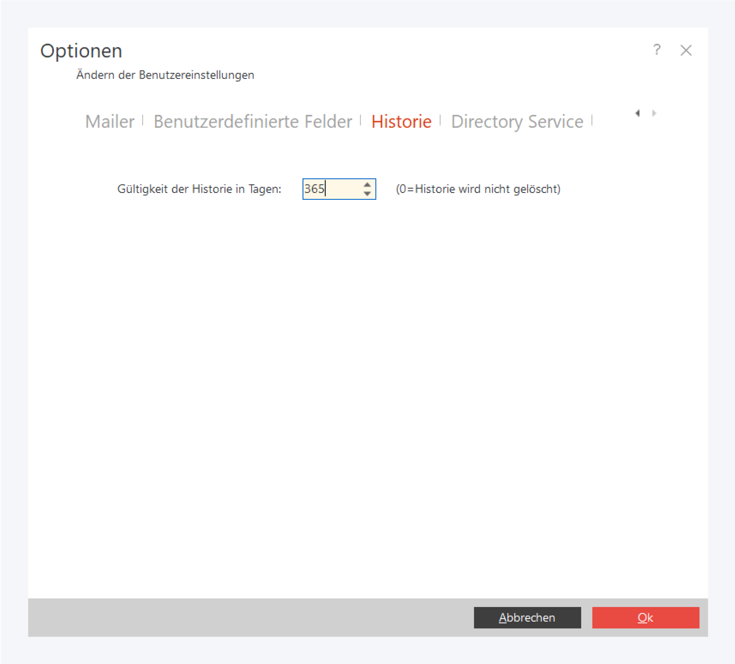 Geben Sie die gewünschte Gültigkeit der Historie in Tagen an. Änderungen, die länger zurückliegen, werden gelöscht.