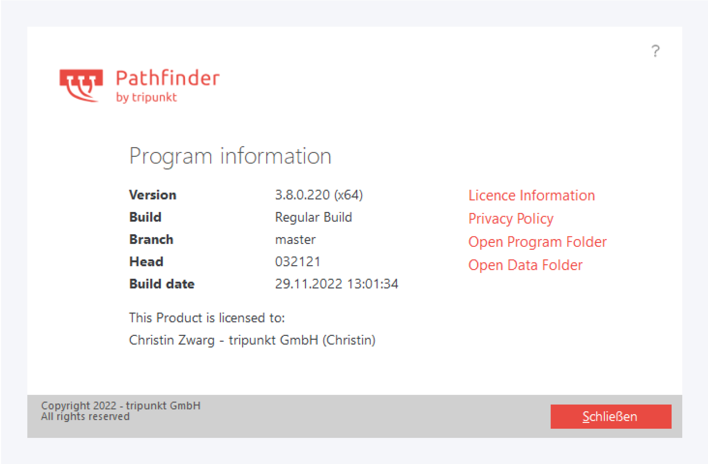 Hier finden Sie auf der linken Seite detaillierte Informationen zur genutzten Pathfinder-Version. Rechterhand finden Sie Informationen zur Lizenz, die Datenschutz-Bestimmungen und Verknüpfungen zum Programm- und Datenordner von Pathfinder.