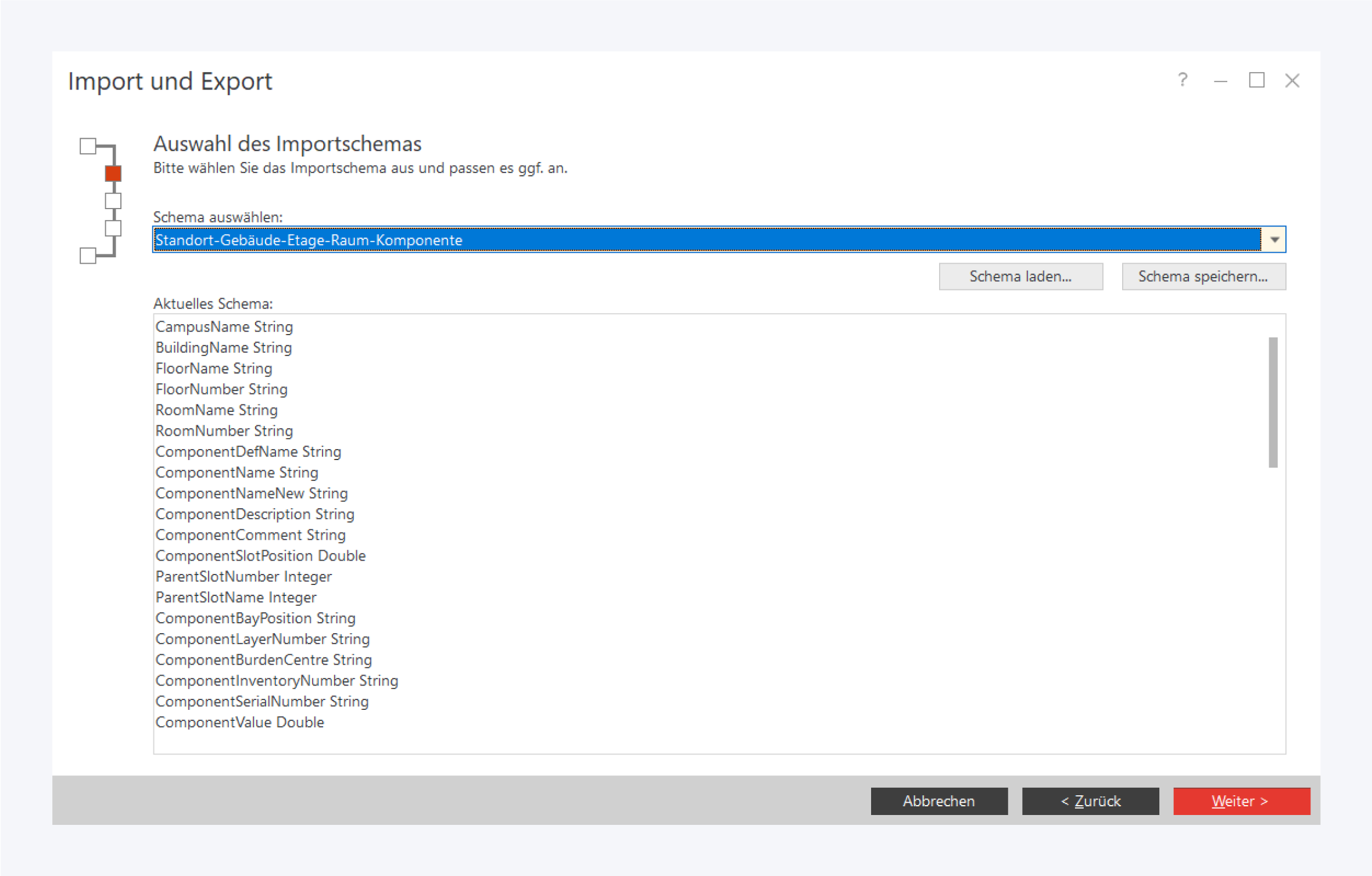 Passen Sie das Schema so an, dass alle Felder aus der Excelliste im Schema enthalten sind. Die möglichen Felder sind unten auf dieser Seite aufgelistet.