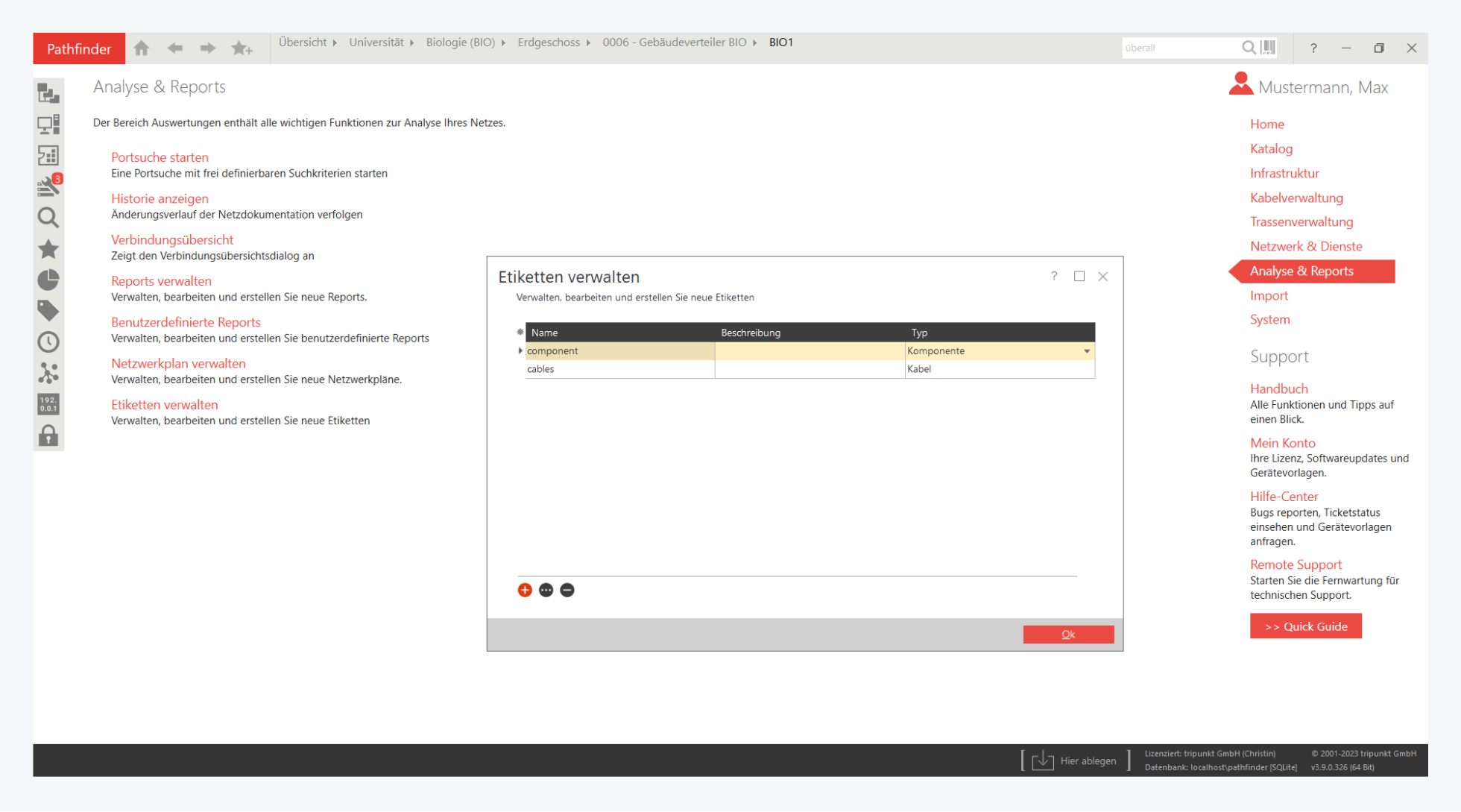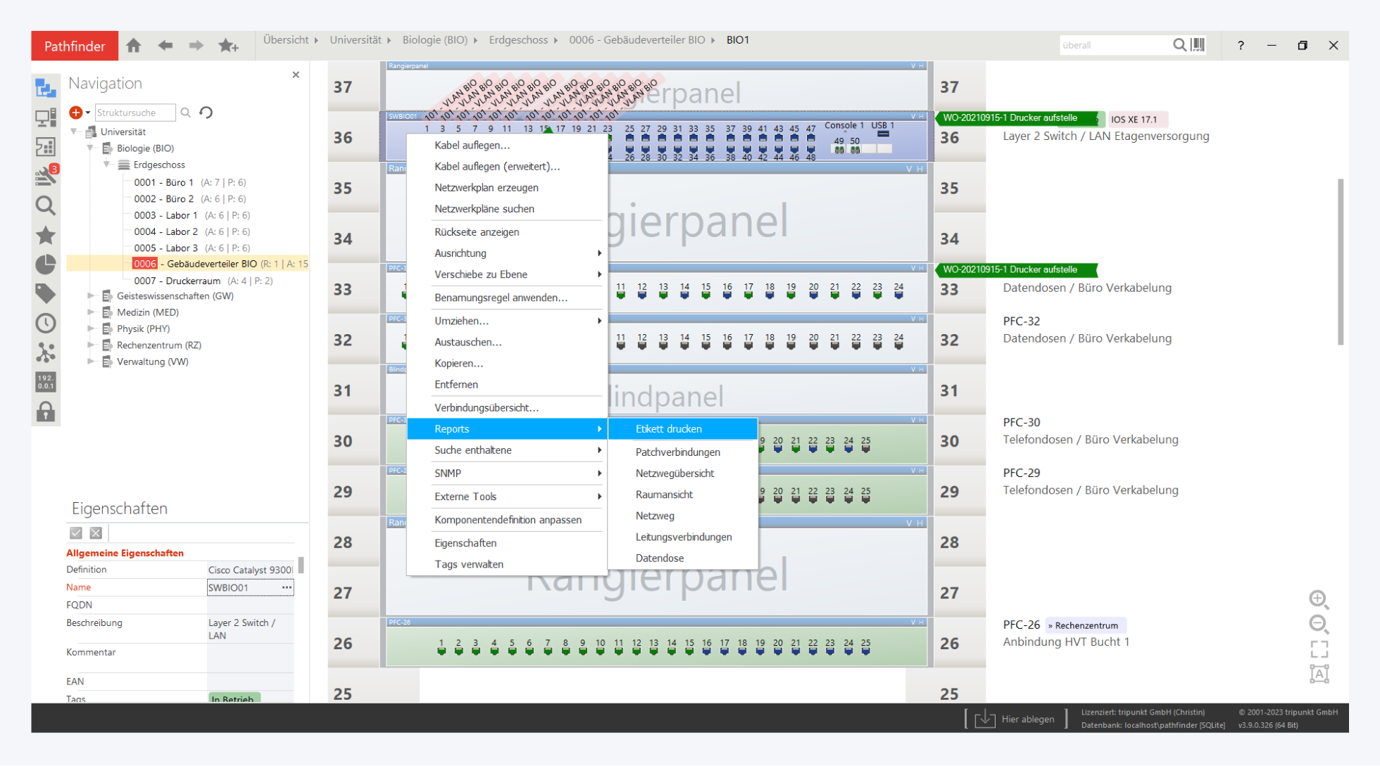 Pathfinder verfügt über die Möglichkeit, Vorlagen für Etikettenlabel zu erstellen, um Geräte oder Kabel für eine vor Ort Belabelung mit Etiketten versehen zu können.