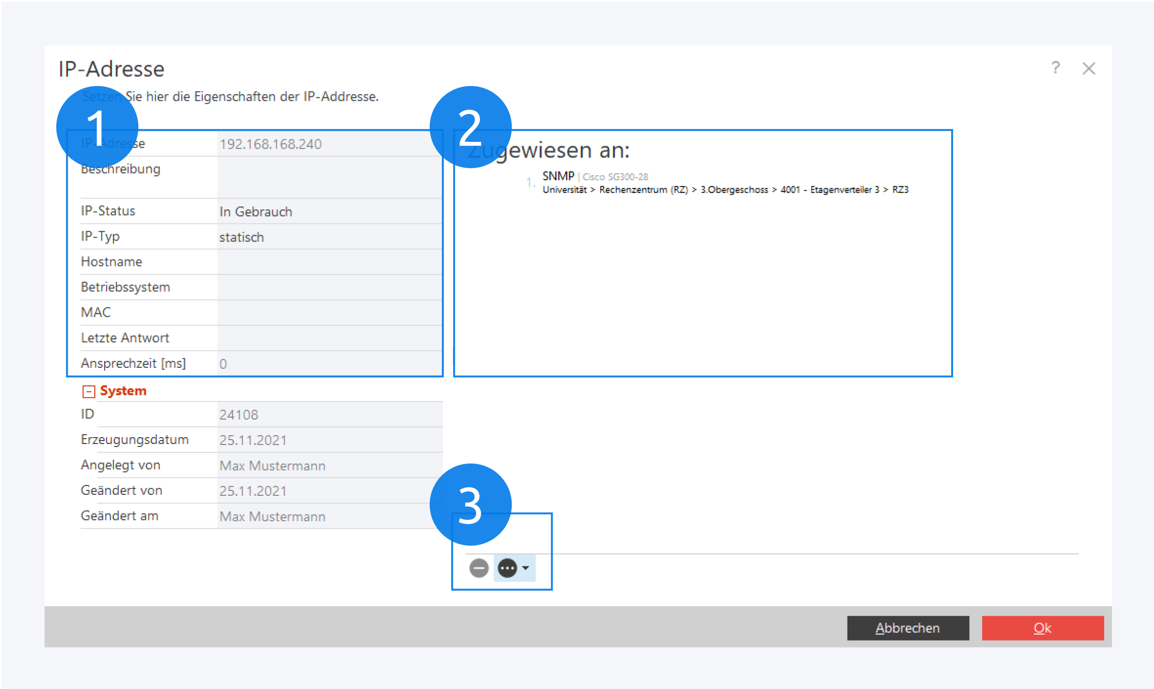 Im unteren Bereich können Sie Zuweisungen entfernen und Listen aller mit der Adresse verknüpften Komponenten oder Kabel öffnen (3).