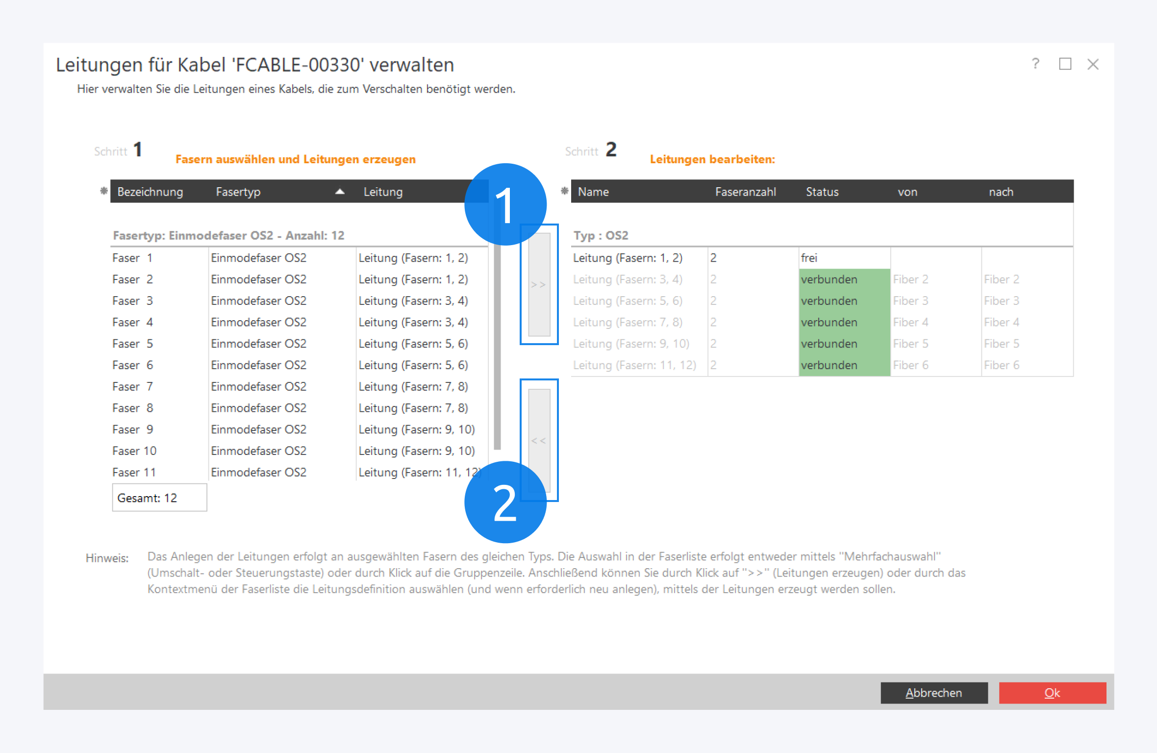 Wählen Sie zunächst die Adern/Fasern aus, die Sie für eine Leitung verwenden möchten. Über Shift und Strg können Sie mehrere Adern/Fasern zugleich auswählen. Klicken Sie anschließend auf >> (1), um eine entsprechende Leitung zu erstellen. Wenn Sie eine bestehende Leitung wieder freigeben möchten, wählen Sie sie aus und klicken auf << (2). Das ist nur möglich, wenn die Leitung aktuell nicht verwendet wird.