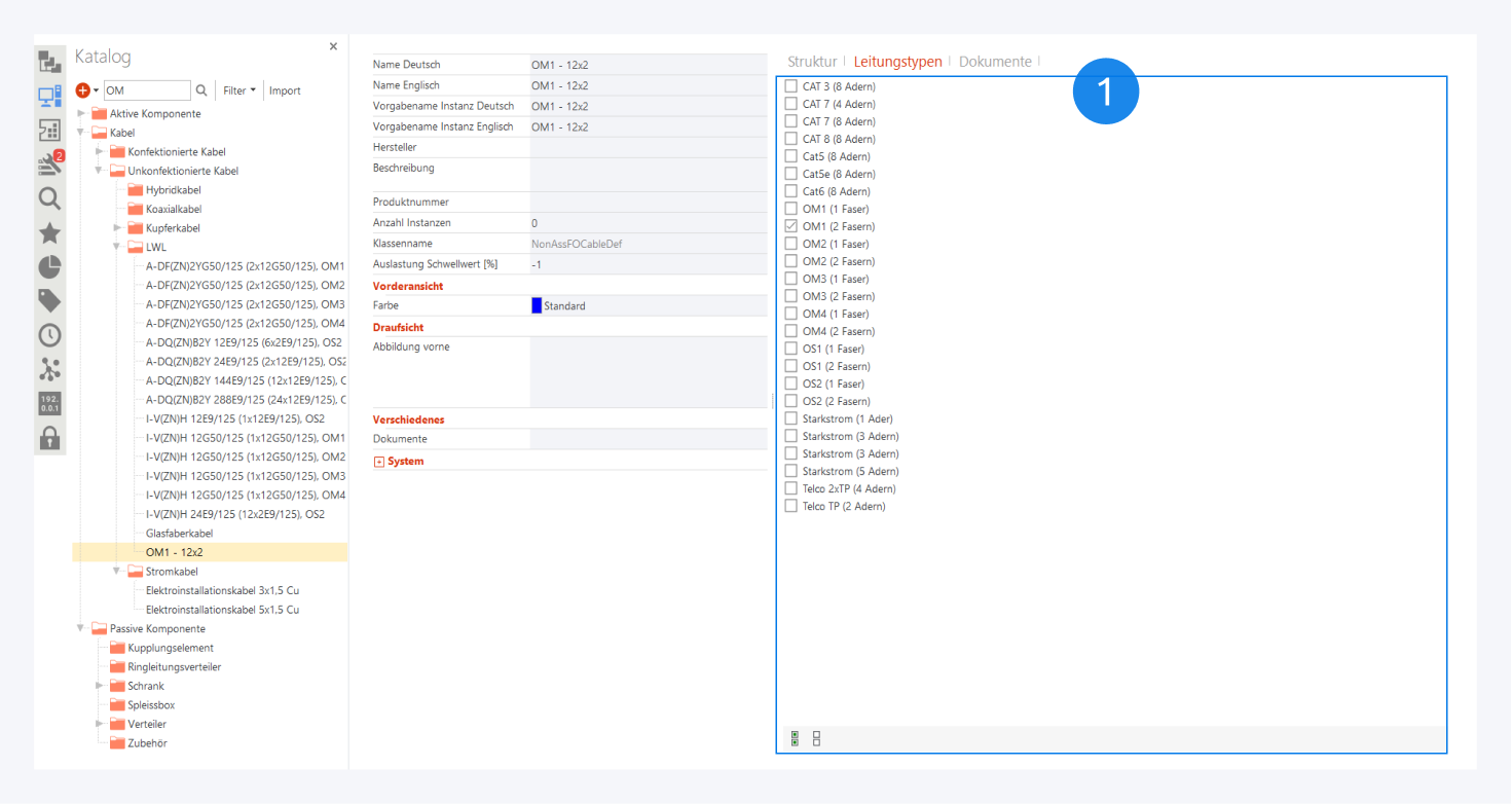 Verlegekabeln werden im Leitungstypen-Tab unterstützte Leitungstypen zugeordnet. Auf Basis dieser Typen werden anschließend Verbindungen hergestellt (1).