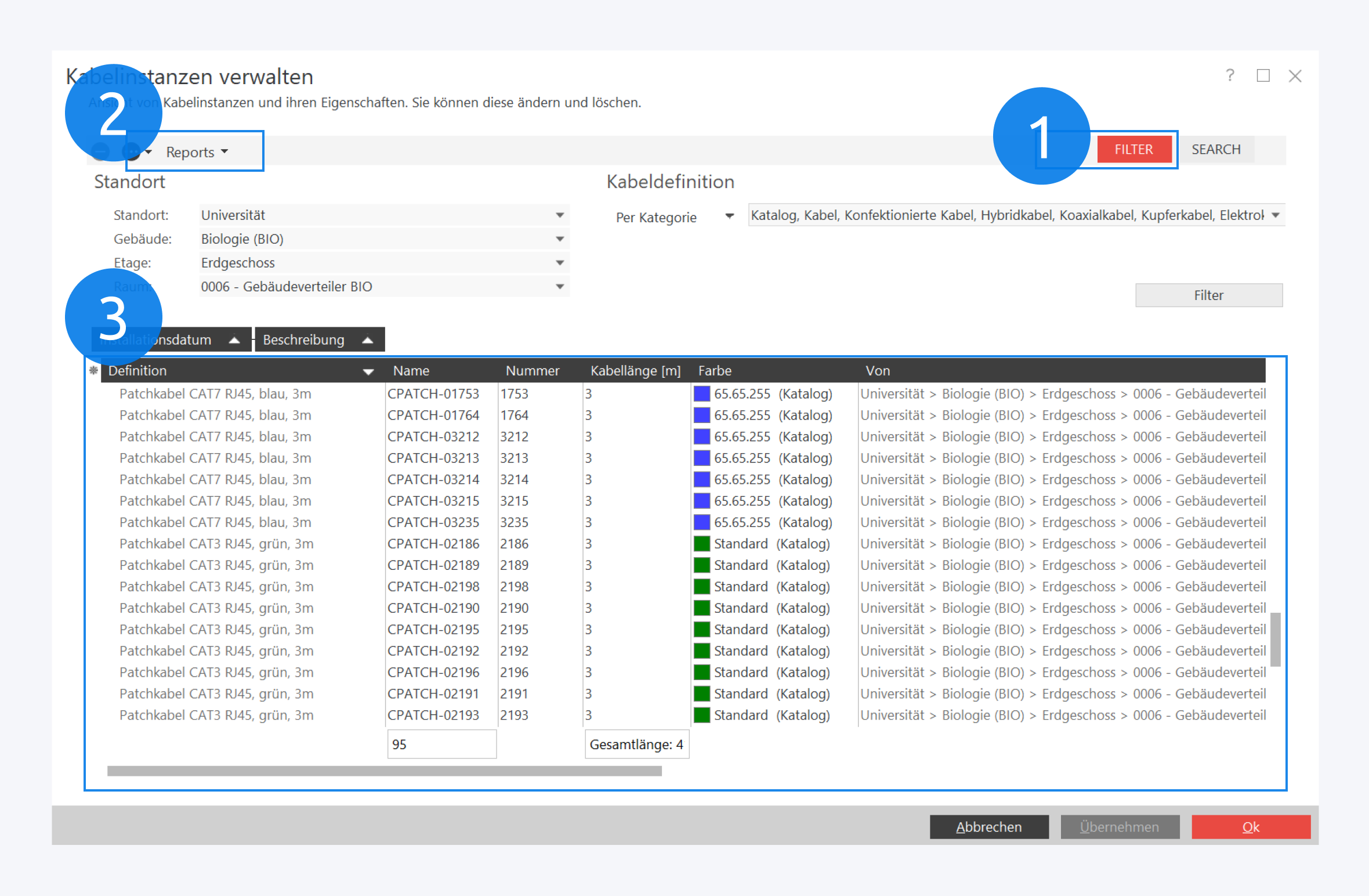 Hier finden Sie eine Liste aller Kabel, die beliebig nach Ort, Kategorie, Kabeldefinition und Tags gefiltert (1) werden kann.