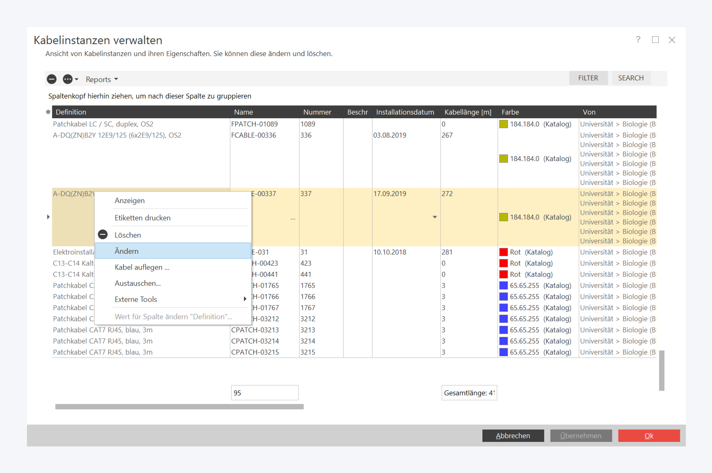 Die Kabelinstanzverwaltung kann verwendet werden, um sich einen detaillierten Überblick über alle dokumentierten Auflege- und Patchkabel zu verschaffen.