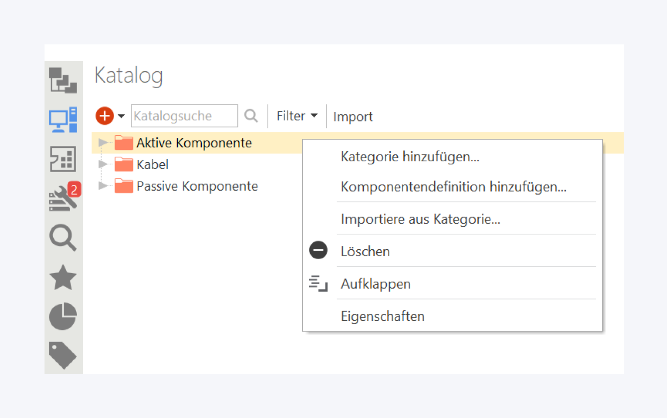Die Vorlagen sind in die Kategorien Aktive und Passive Komponenten, sowie Kabel unterteilt, die sich jeweils auch aus übersichtlichen Unterkategorien zusammensetzen.