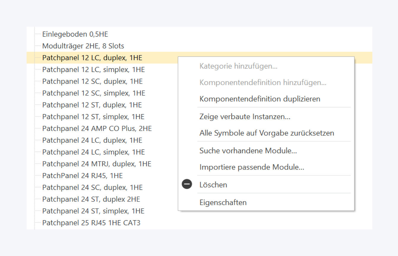 Im Kontextmenü der Komponentendefinitionen finden Sie folgende Funktionen: