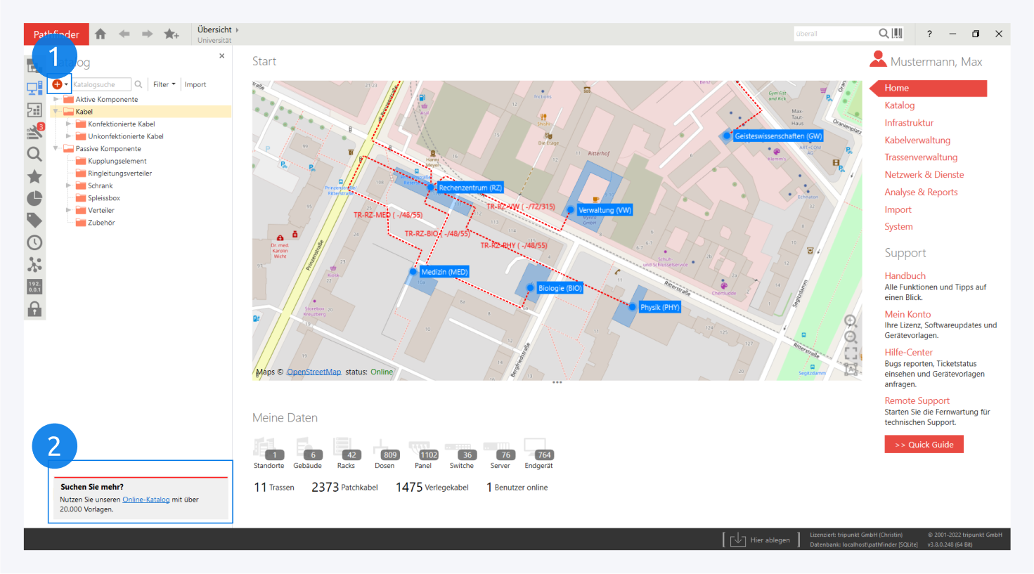 Hier können Sie neue Komponentendefinitionen erstellen (1), oder vorgefertigte Geräteschablonen aus dem Onlinekatalog importieren (2).