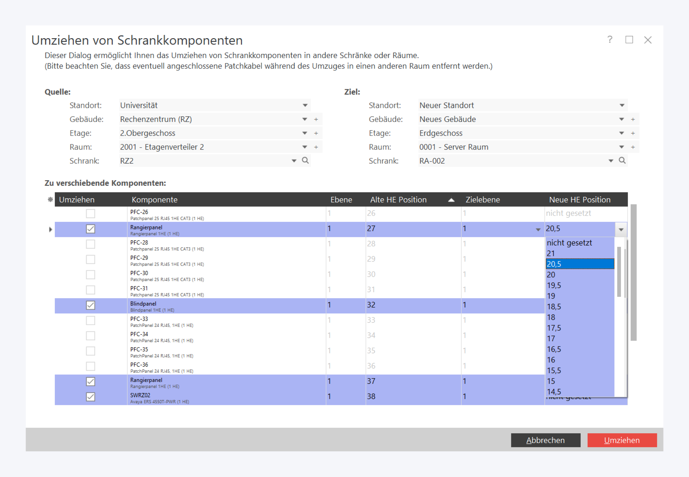 Wählen Sie zunächst Quell- und Zielschrank, sowie die zu verschiebenden Geräte aus. Bestimmen Sie anschließend die Zielebene sowie die gewünschte HE-Position und schließen Sie den Vorgang mit einem Klick auf Umziehen ab.