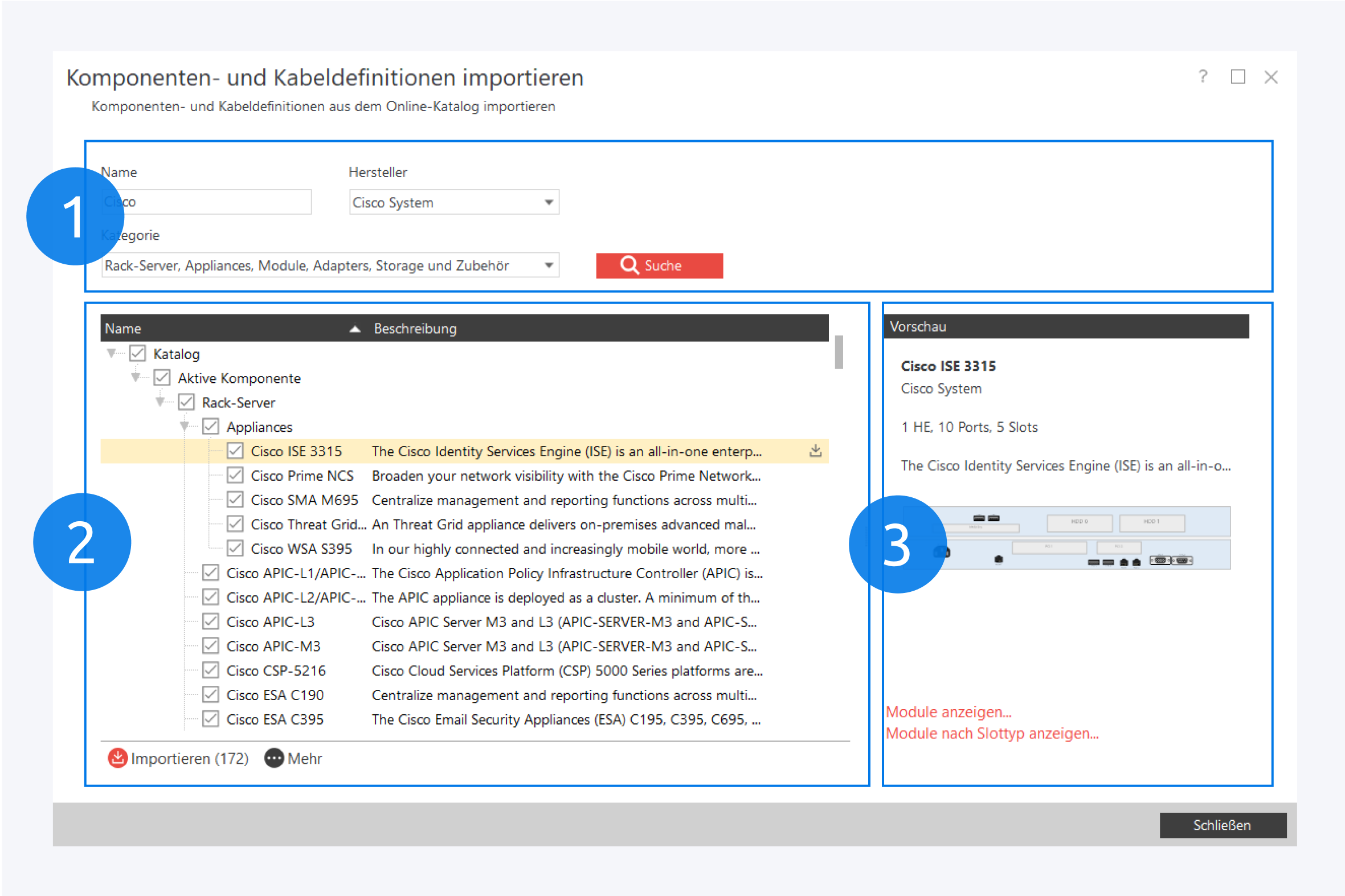 Wählen Sie die benötigten Vorlagen aus und klicken Sie auf Importieren, um sie zum lokalen Katalog hinzuzufügen (2). Auf der rechten Seite befindet sich jeweils eine Vorschau der aktuell markierten Komponente (3).