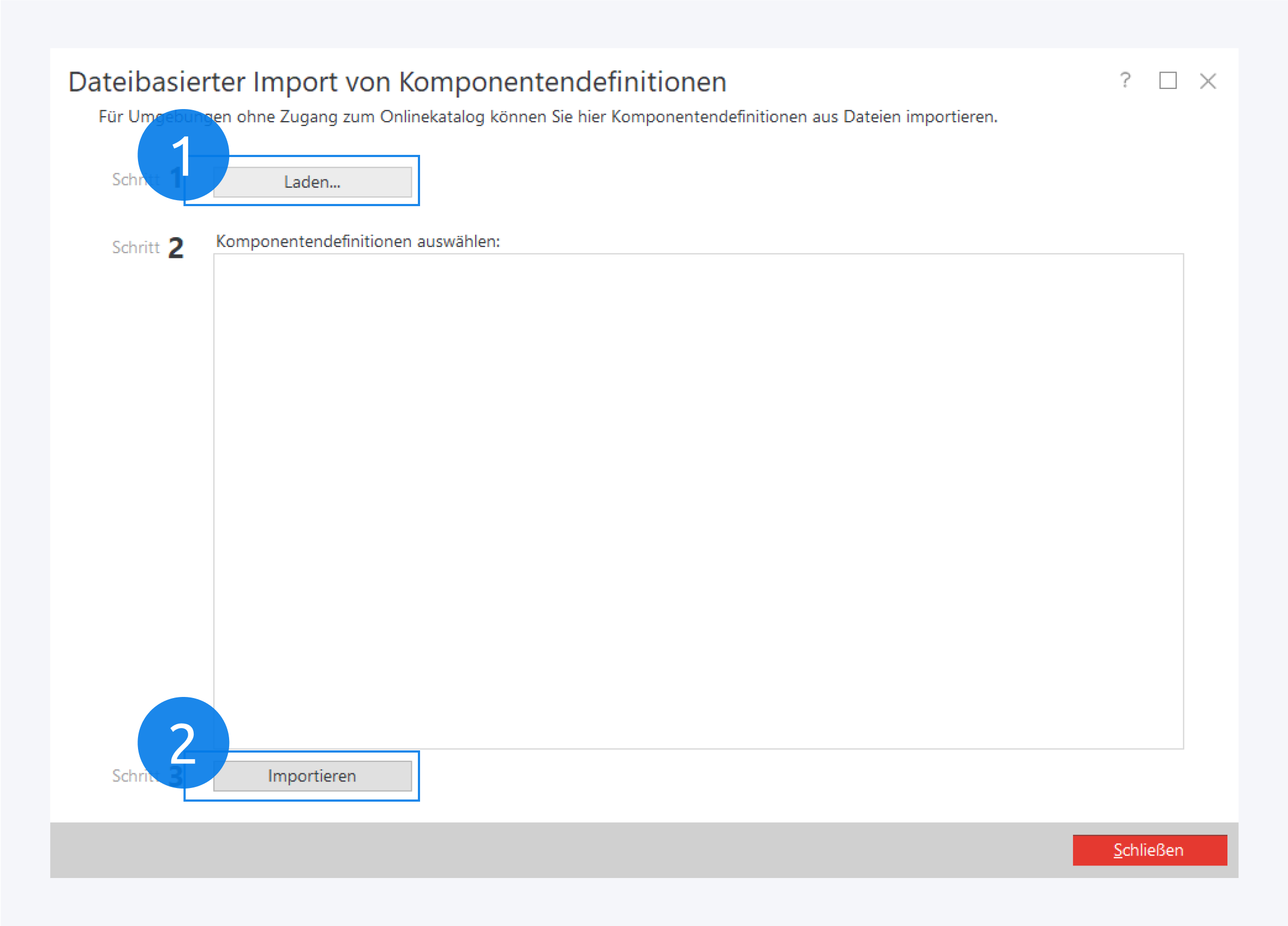 Wählen Sie die Datei, die die Komponentendefinitionen enthält, aus (1). Anschließend wird eine Liste enthaltener Komponentendefinitionen angezeigt und Sie können die gewünschten Vorlagen auswählen.
