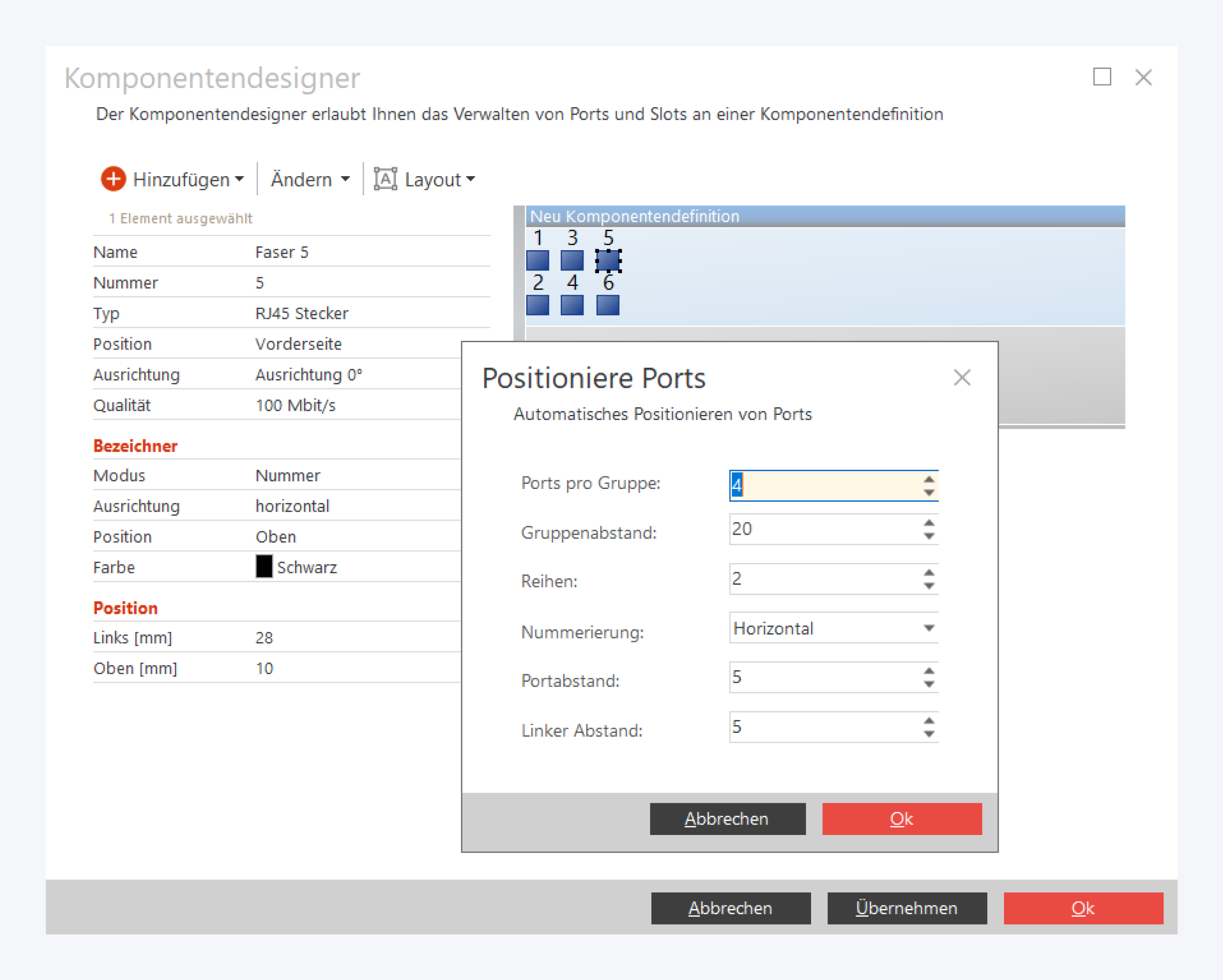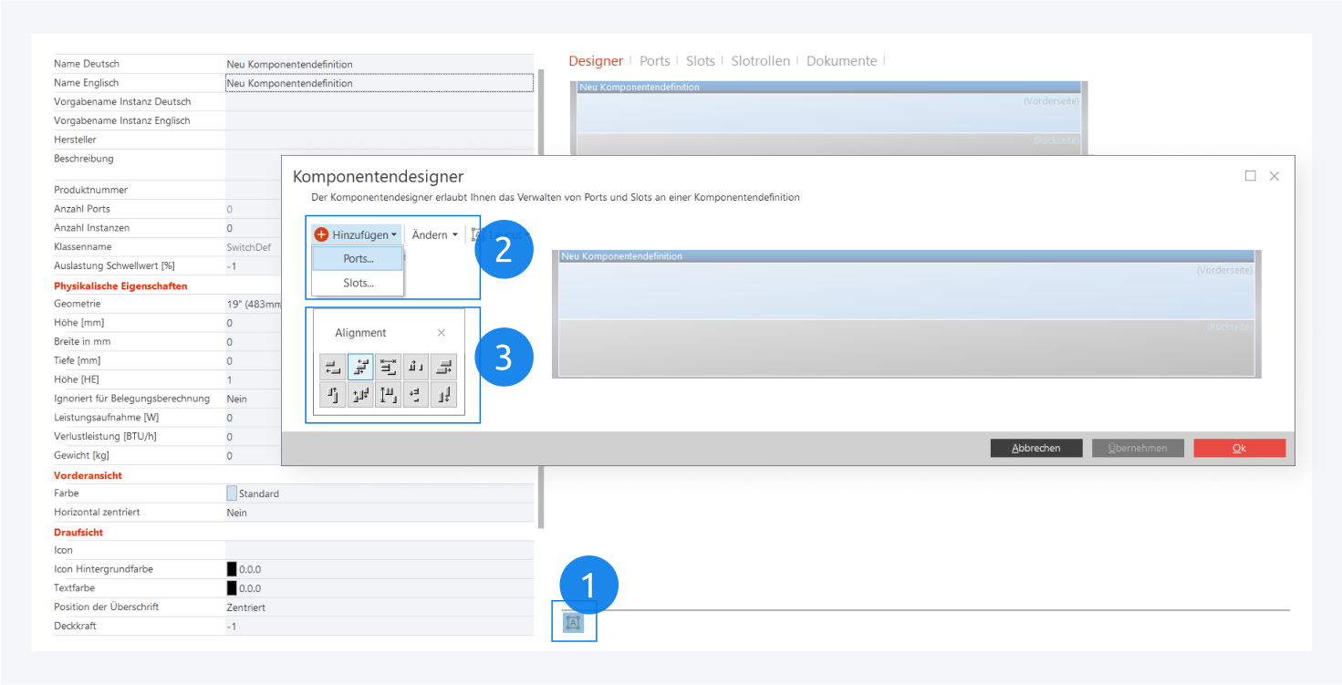 Hier können Sie Ports und Slots zur Komponentendefinition hinzufügen (2) und anschließend deren Layout anpassen.