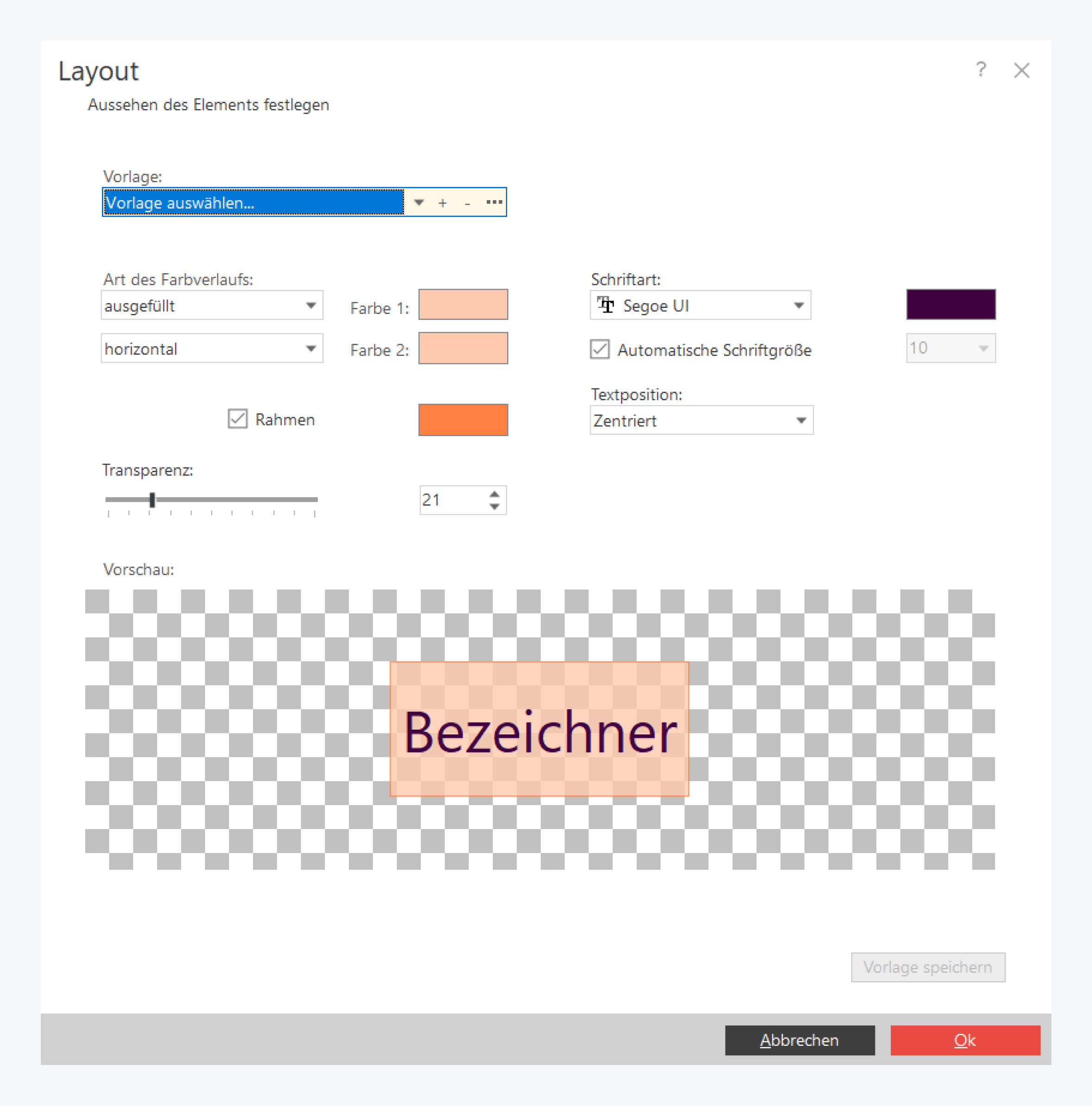 Im Layoutdialog können Sie die Darstellung der Bezeichner anpassen. Es stehen detaillierte Optionen zu Schrift- und Hintergrundfarbe, Schriftart, sowie Transparenz zur Verfügung.