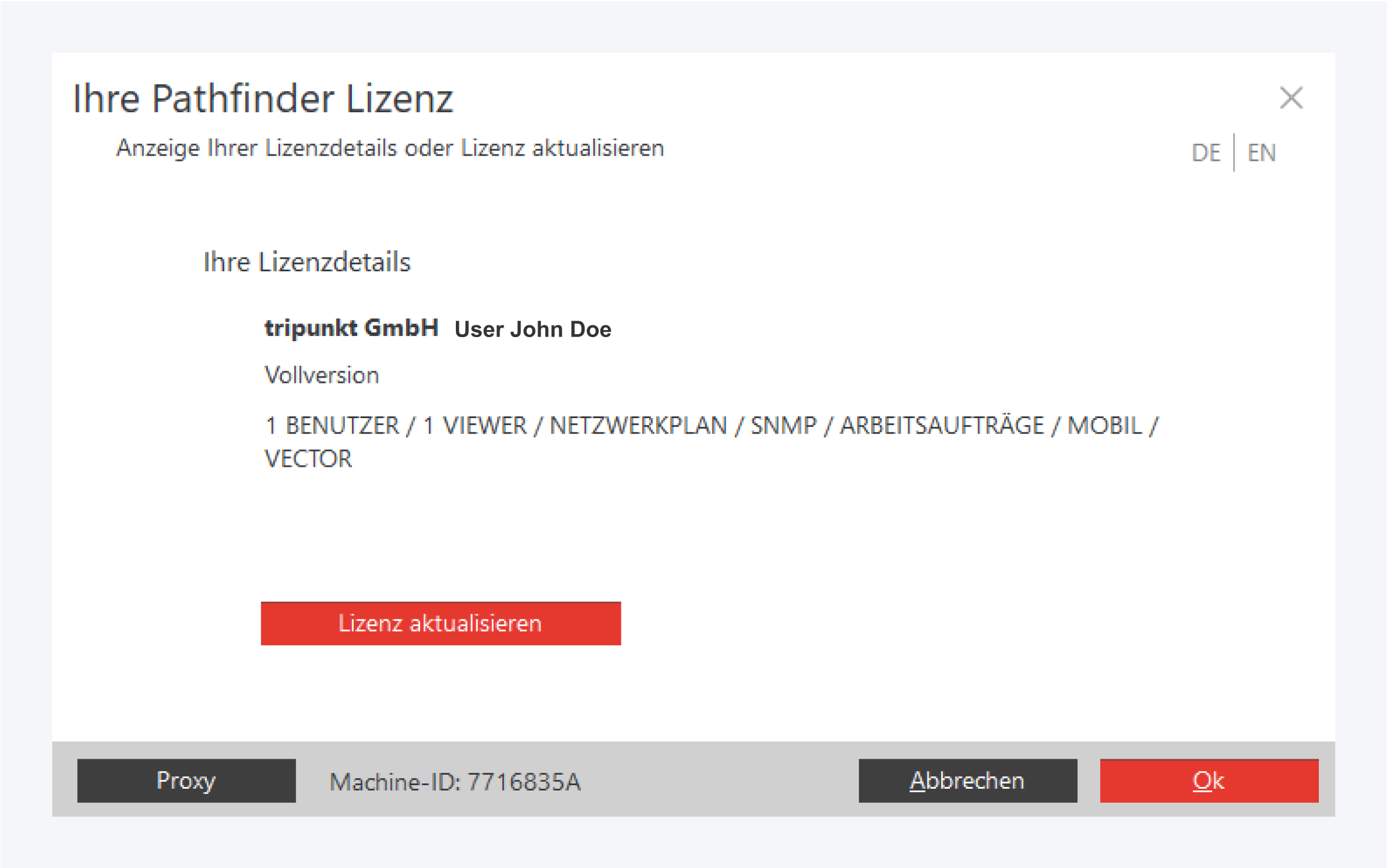 Darunter finden Sie die Anzahl der Benutzer, die mit dieser Lizenz gleichzeitig mit Pathfinder arbeiten können, sowie die lizenzierten Module.