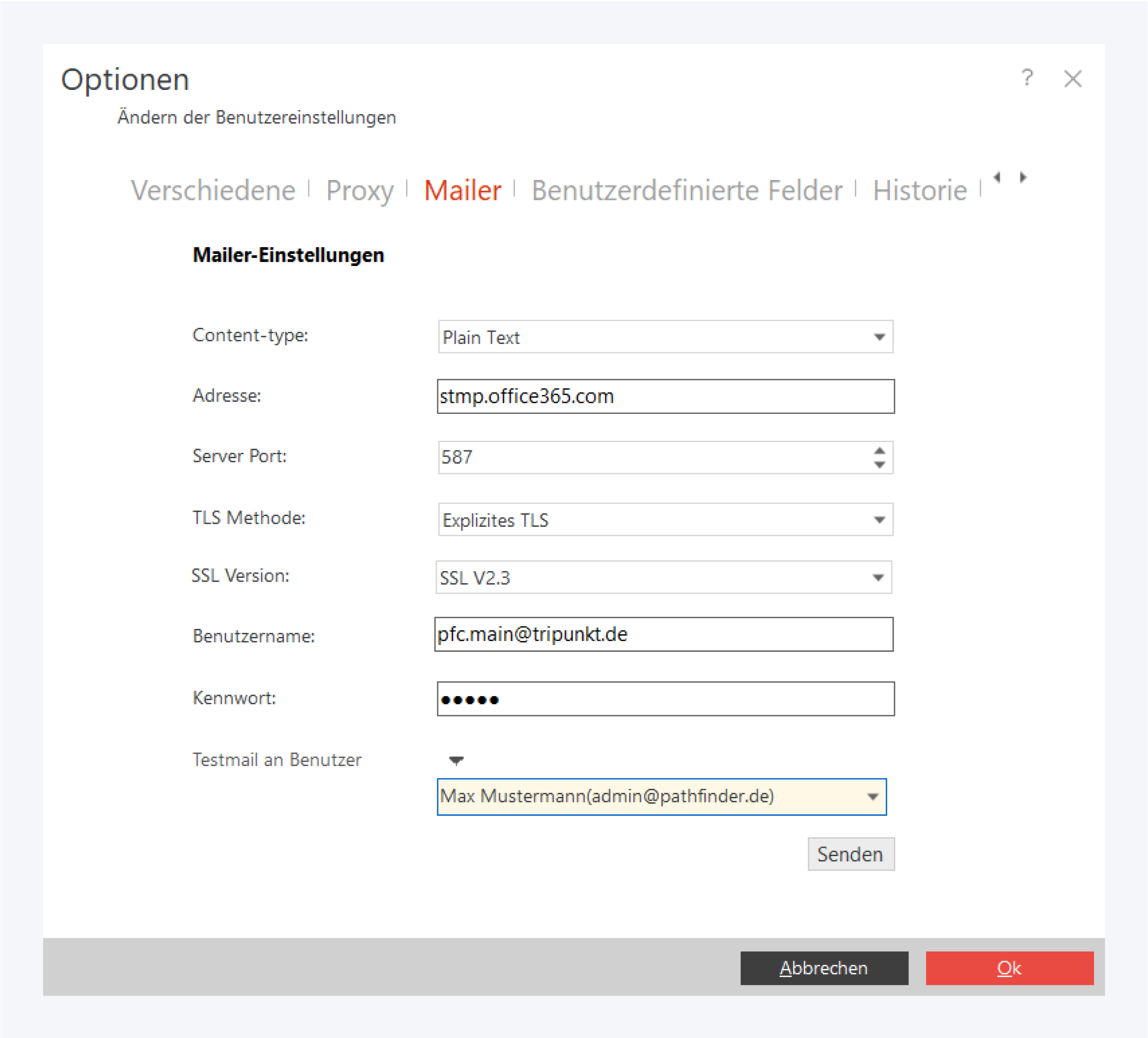 Testmail an Benutzer: Wählen Sie einen Benutzer aus, dem eine Testnachricht gesendet werden soll und klicken Sie auf Senden, um den Test durchzuführen.
