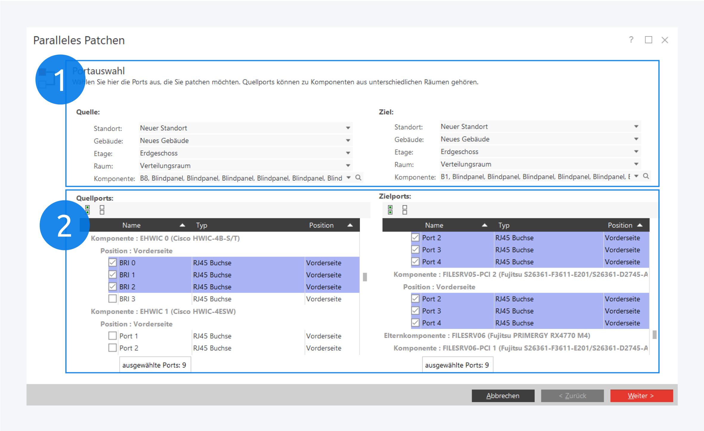 Wählen Sie Quell- und Zielkomponenten (1), sowie die Ports (2) aus. Die Anzahl der Ports muss auf beiden Seiten identisch sein.