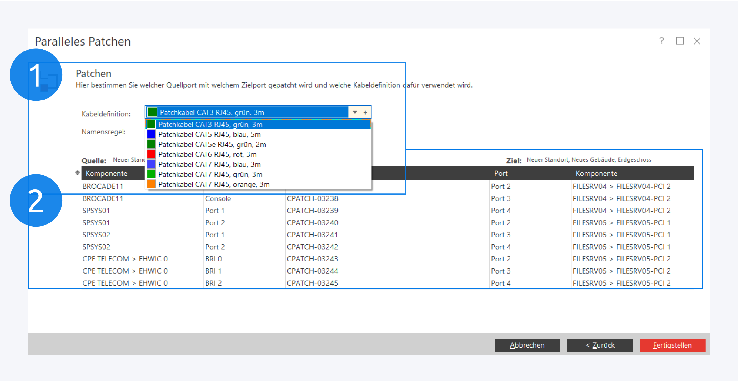 Unterhalb wird eine Liste aller zu erstellenden Verbindungen abgebildet (2). Sie können die Zuweisung der Ports beliebig per Drag&Drop anpassen.