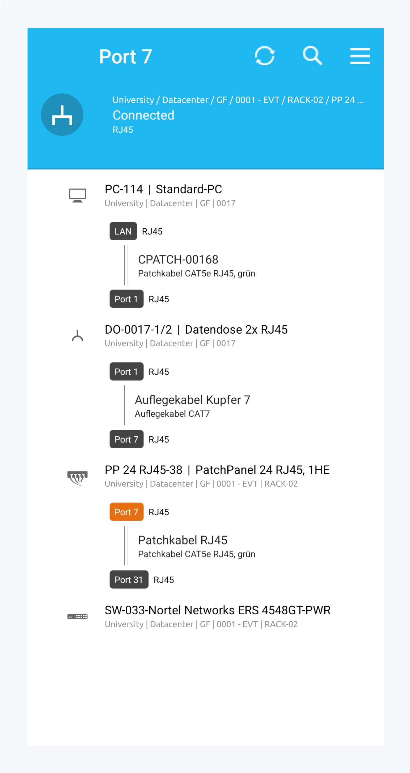 ![]() | Tippen Sie auf einen Port, um den zugehörigen Netzweg anzuzeigen. Hier finden Sie alle Ports entlang des Netzwegs und die zugehörigen Komponenten. Der Port über den der Netzweg geöffnet wurde, wird orange hervorgehoben. Zusätzlich werden hier auch Informationen zu den Kabeln entlang des Netzwegs angezeigt. |