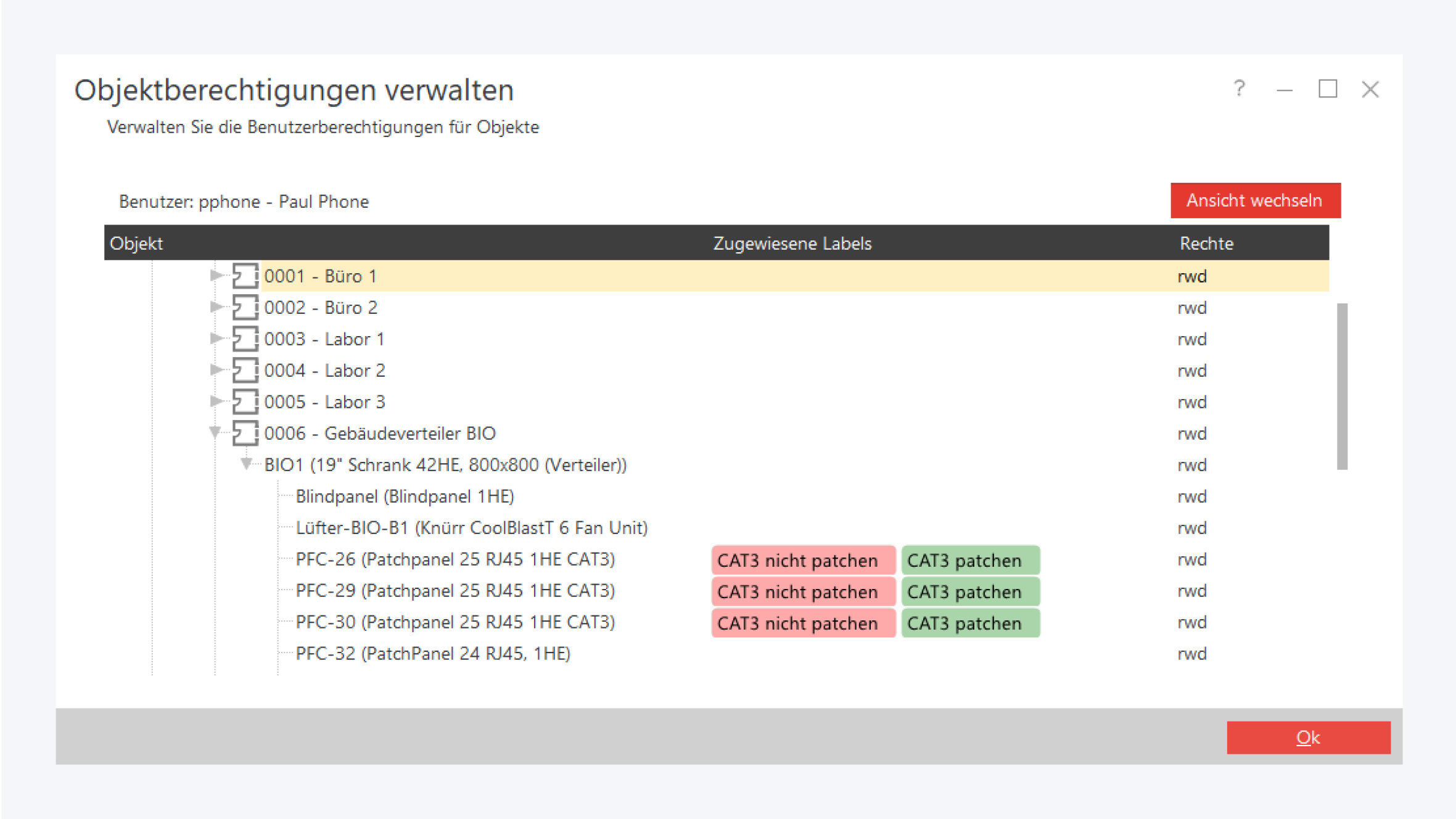 Der Verwaltungsdialog enthält den Navigationsbaum, sowie die jeweils zugewiesenen Security Labels. Rechterhand werden die Zugriffsrechte des ausgewählten Benutzers für das jeweilige Objekt angezeigt. r steht hier für Leserechte, w für Schreibrechte und d für Löschrechte.