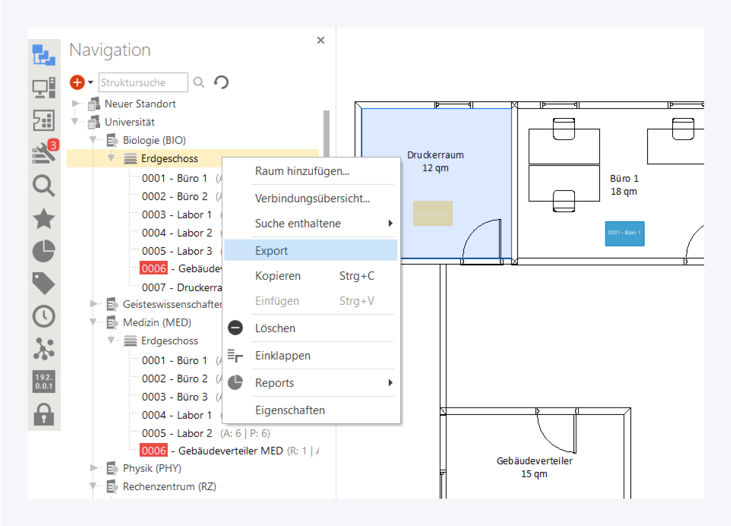 Navigieren Sie zu dem Objekt, das exportiert werden soll. Es werden immer alle untergeordneten Objekte eingeschlossen, mit der Ausnahme von Kabeln, die nicht vollständig im Kontext enthalten sind.