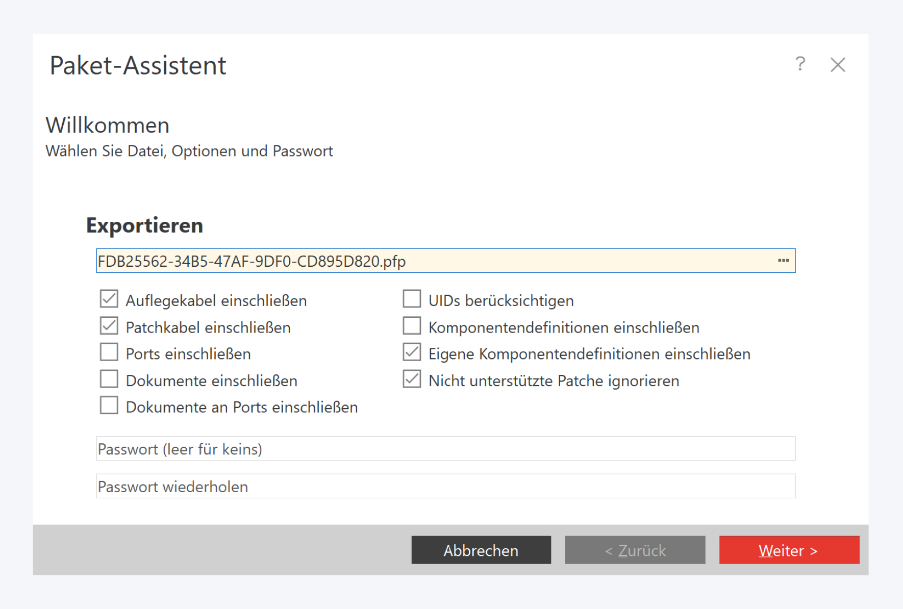 Geben Sie optional ein Passwort an und klicken Sie auf Weiter, um mit dem Export zu beginnen.