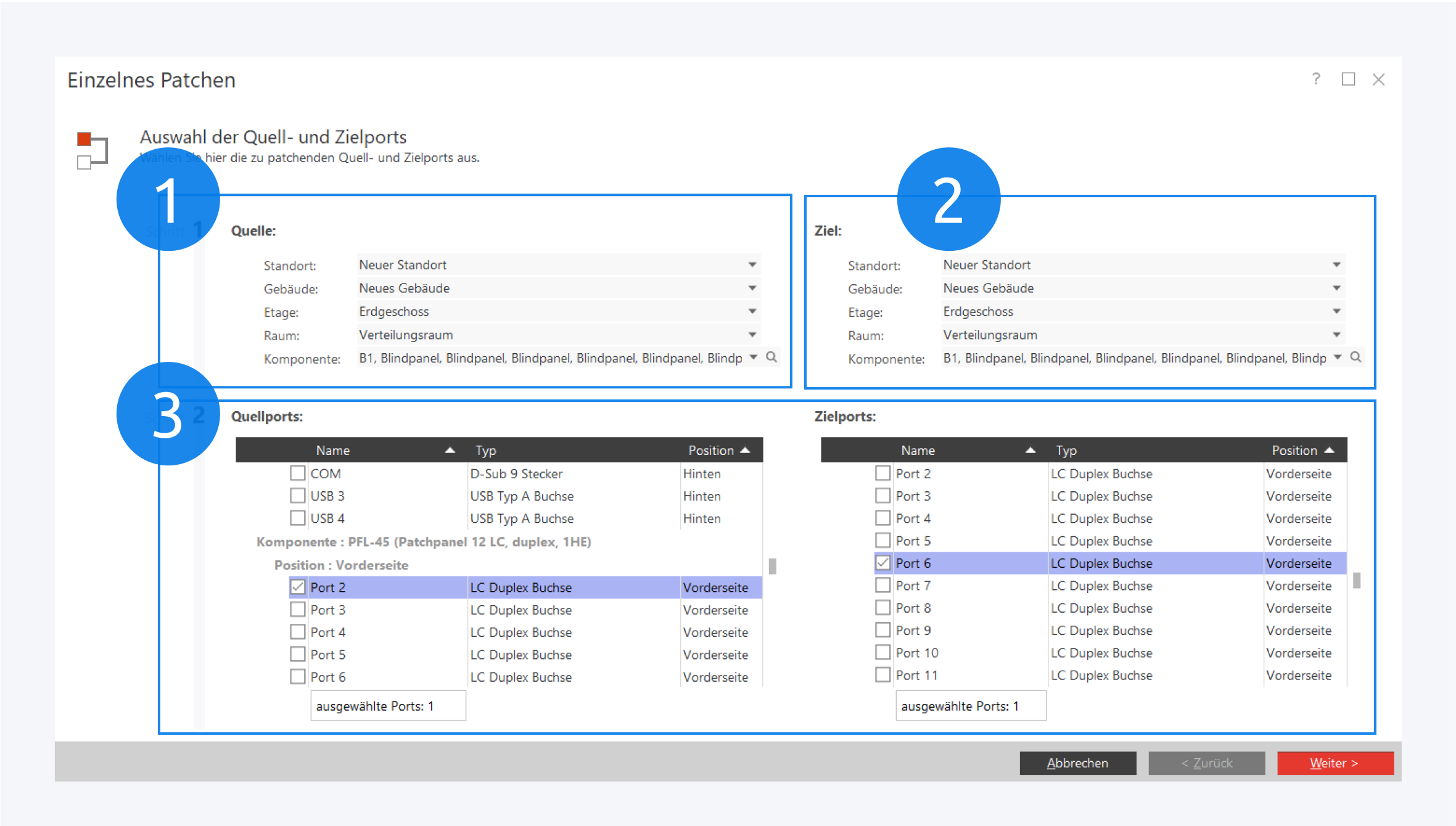 Es ist möglich, auf einer Seite mehrere Ports auszuwählen, falls ein Kabel auf einer Seite mehrere Anschlüsse hat.