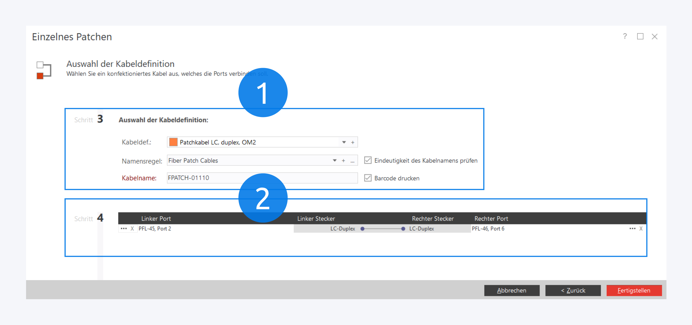 Pathfinder wird automatisch ein zur Portauswahl passendes Kabel vorschlagen (1). Wenn kein passendes Kabel existiert, können Sie ein neues erstellen oder aus dem Onlinekatalog importieren.