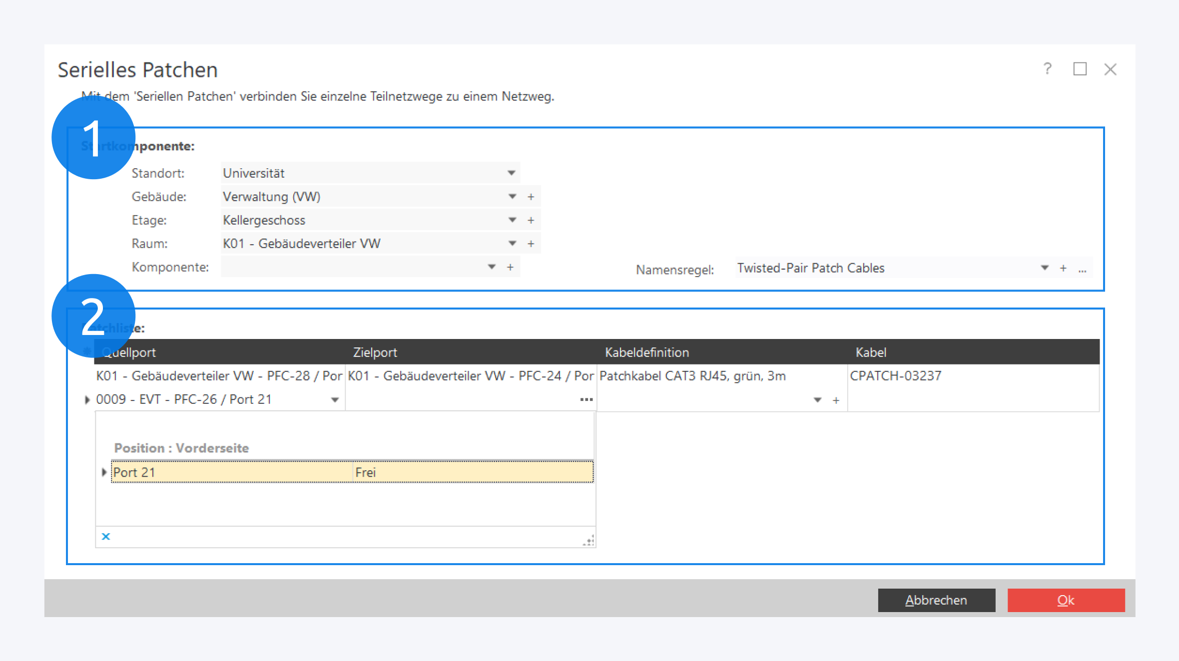 Wählen Sie zunächst die Startkomponente und eine Namensregel für die zu erstellenden Kabel aus (1). Anschließend kann der erste Quellport in der Patchliste ausgewählt werden (2).