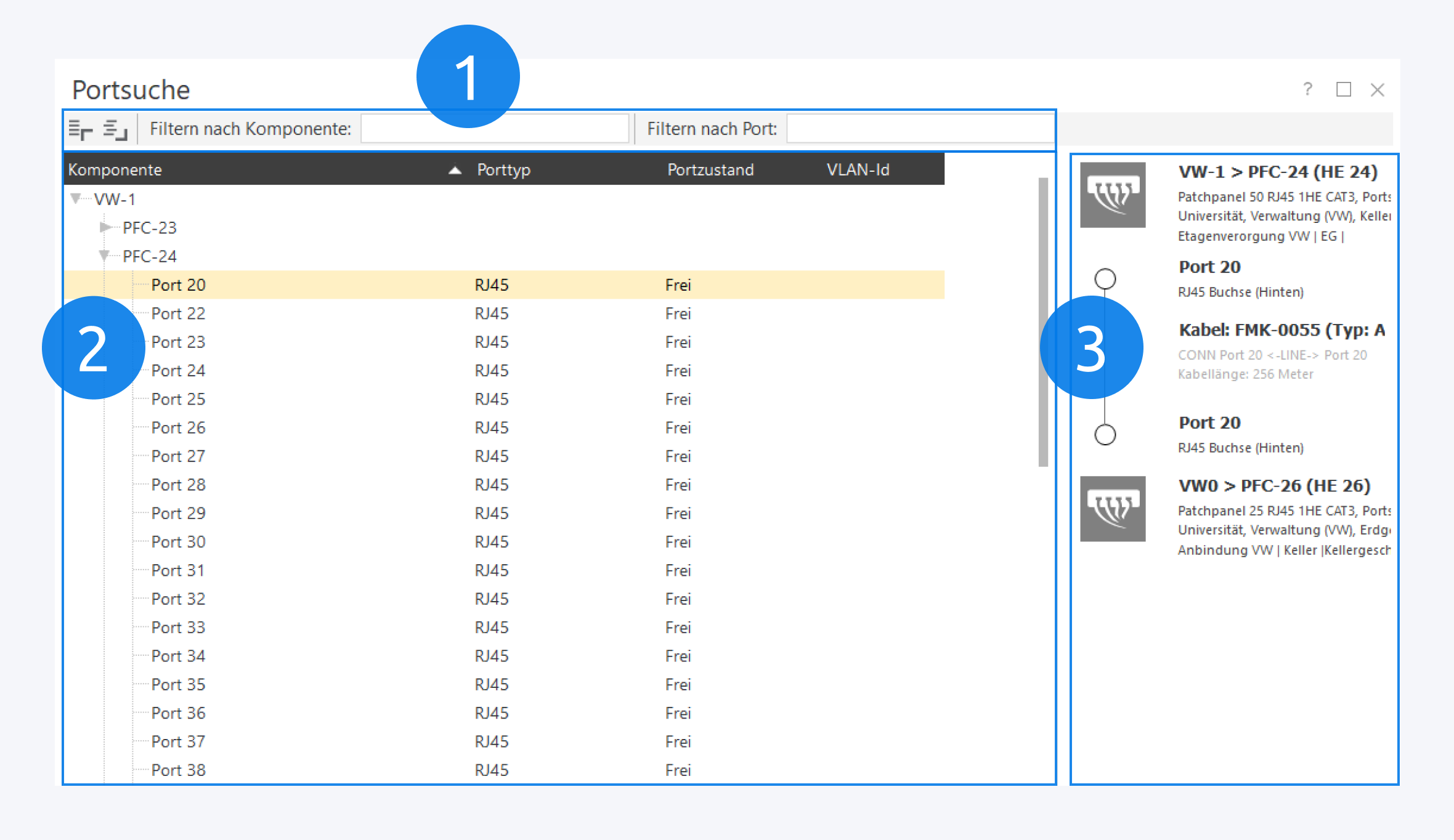 Sie können nach Komponenten und Ports filtern (1) und dann in der Liste (2) den gewünschten Port auswählen. Auf der rechten Seite wird der Netzweg des markierten Ports angezeigt (3).