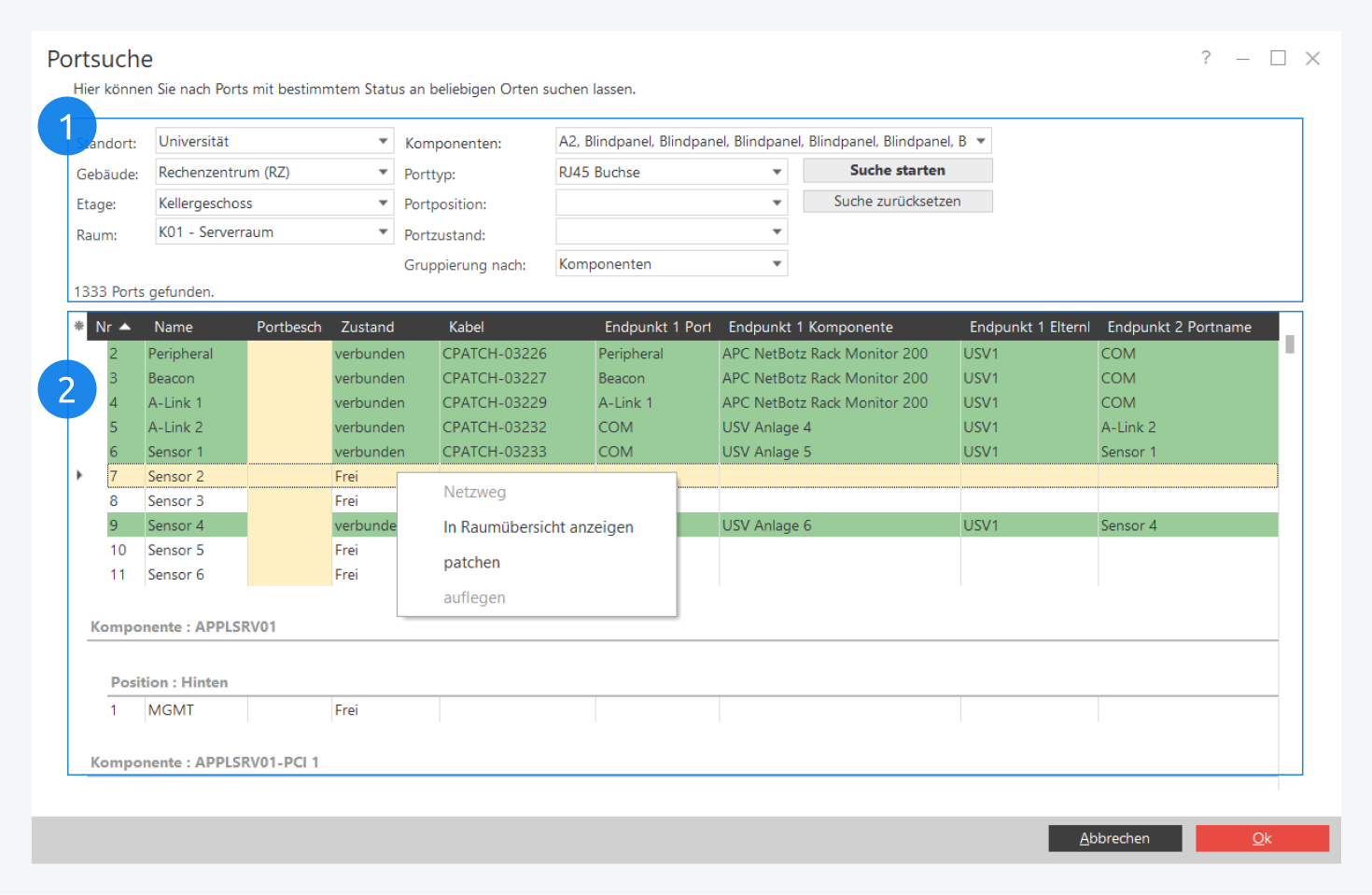 Sie können nach Standort, Komponenten, Porttyp, -position und -zustand filtern (1).