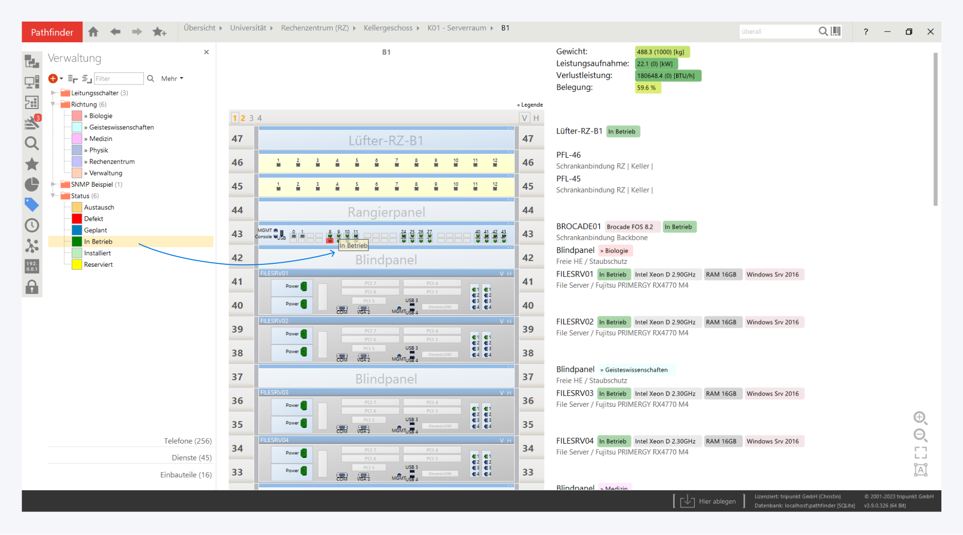 Klicken Sie in unserem Beispiel einfach auf Verwaltung und öffnen die Gruppe Status. Dieses Beispiel soll aufzeigen, dass Sie z.B. einen Zustand von verbauten Geräten kennzeichnen können.