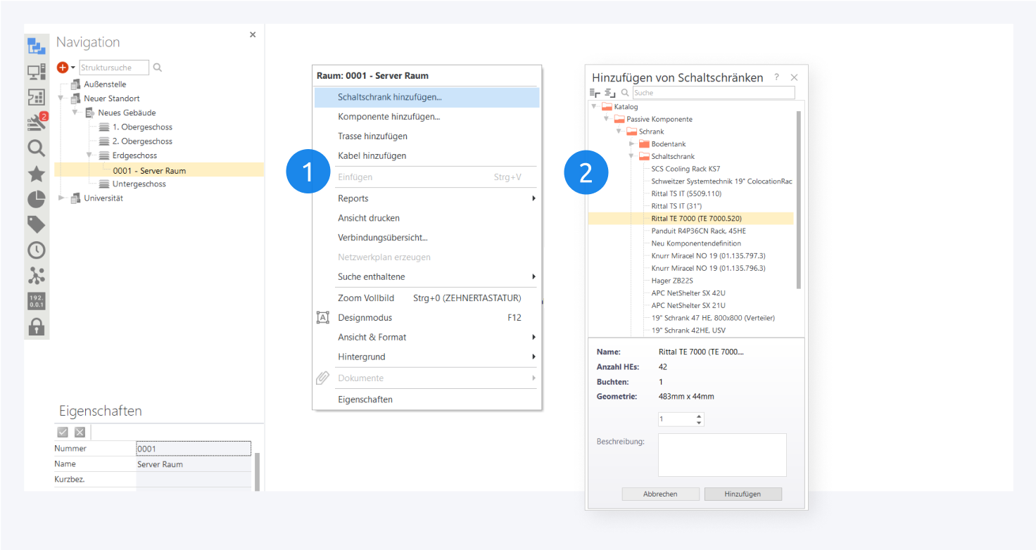 Schaltschränke können entweder über das Kontextmenü innerhalb eines Raumes (1), oder über das Kontextmenüs eines Raums in Navigationstab hinzugefügt werden. Wählen Sie die gewünschte Komponentendefinition aus dem lokalen Katalog aus (2) und geben Sie die gewünschte Menge ein. Mit einem Klick auf Hinzufügen werden die Schränke im Raum platziert.
