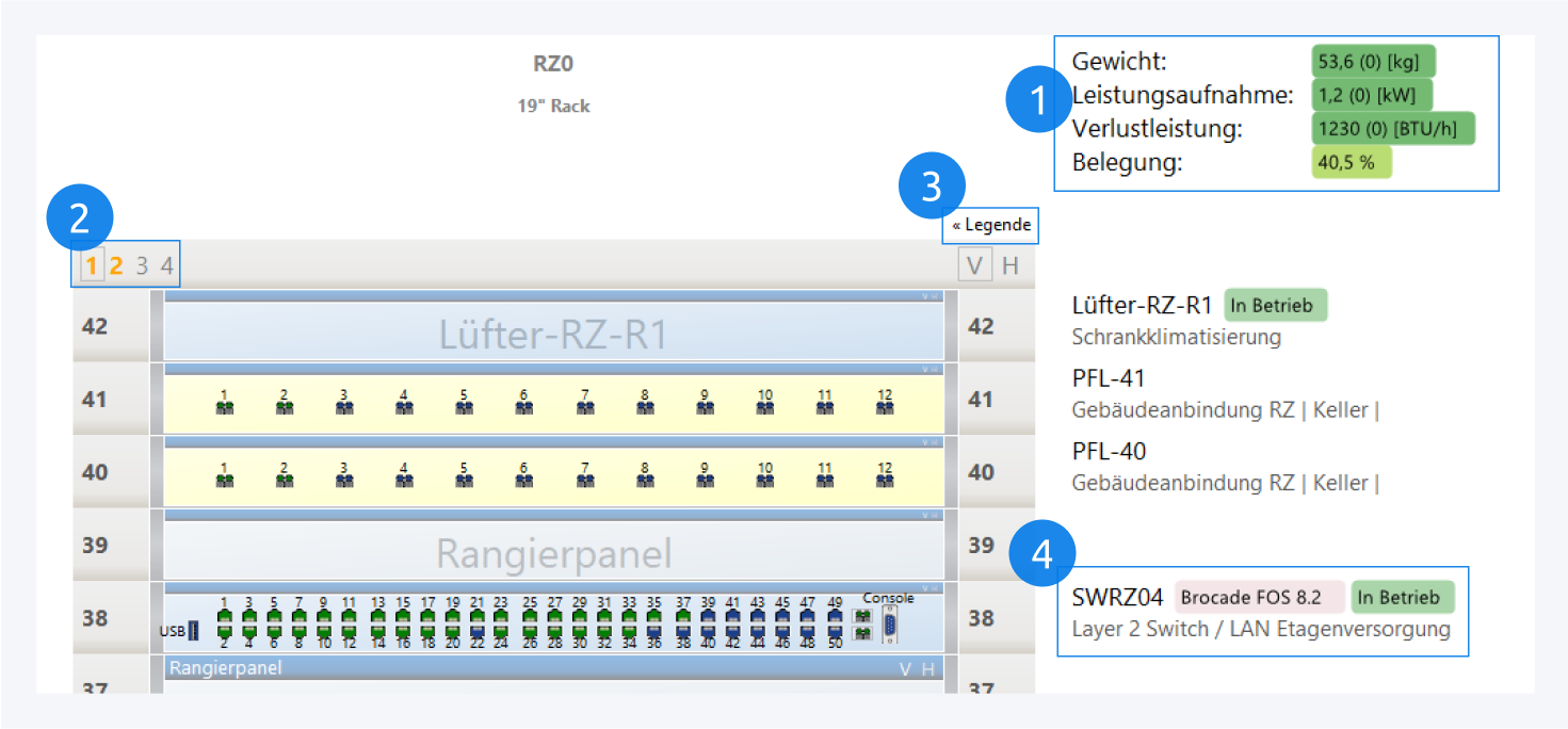 Oben rechts wird die Schranklegende (1) angezeigt. Diese wird automatisch angepasst, wenn sich etwas im Schrank ändert und bietet einen schnellen Überblick über die Daten, der im Schrank verbauten Komponenten.