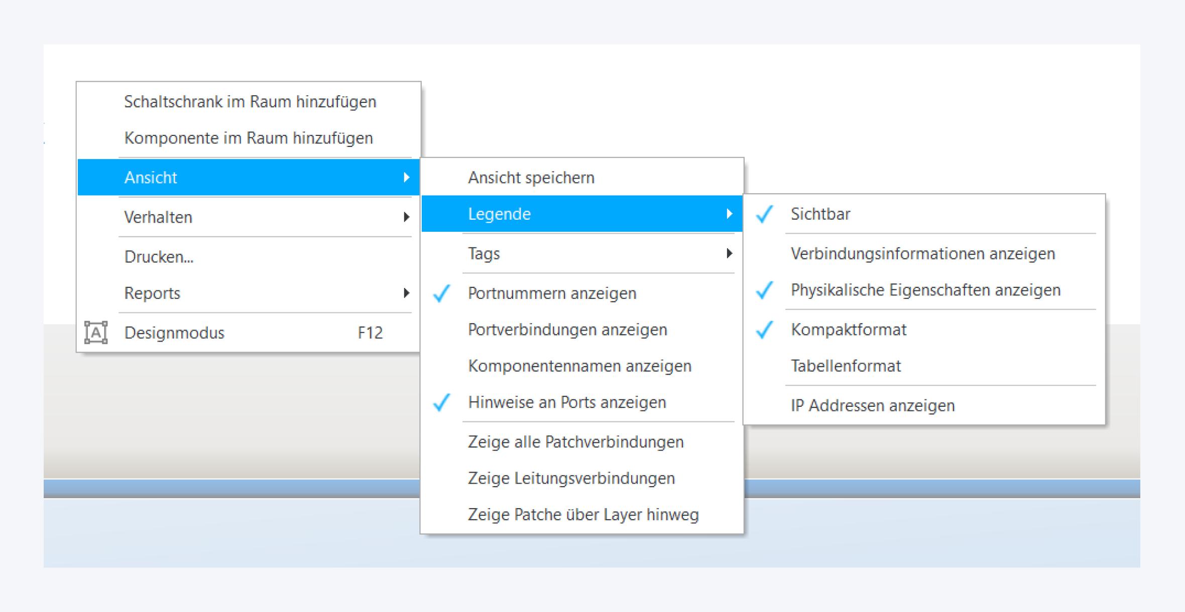 Zeige Leitungsverbindungen: Entscheiden Sie, ob alle Leitungsverbindungen innerhalb des Schranks immer angezeigt werden sollen.