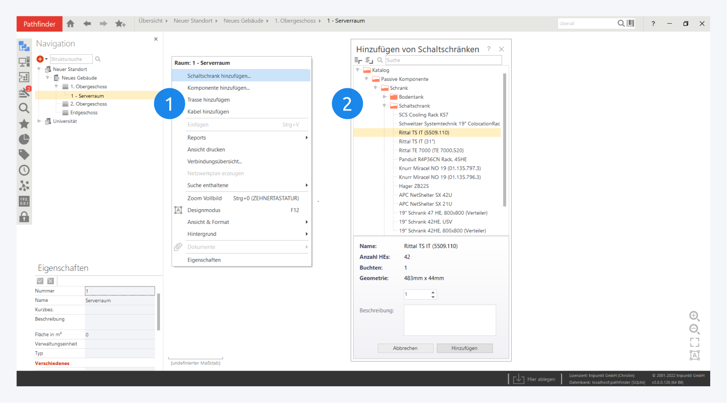 Wählen Sie im Kontextmenü Schaltschrank hinzufügen… (1), um über den sich öffnenden Dialog Schränke zu erstellen. Geben Sie, nach Auswahl der richtigen Komponentendefinition (2), die gewünschte Anzahl an und bestätigen mit einem Klick auf Hinzufügen. Um stattdessen eine freistehende Komponente (z.B. Endgerät oder Datendose) zu erzeugen, klicken Sie stattdessen Komponente hinzufügen…. Alternativ können Sie Komponenten auch direkt aus dem Katalogtab der Sidebar per Drag&Drop platzieren.