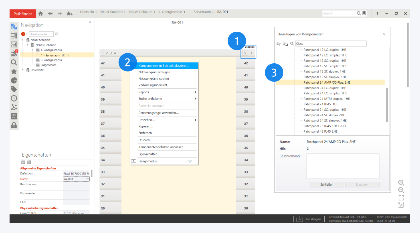 Einbaugeräte, wie beispielsweise Patchpanel, Server, Router oder Switche, werden in Pathfinder in Schränken platziert.