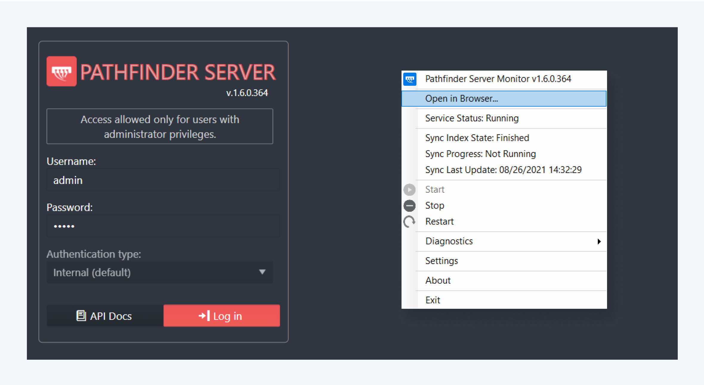 Nun befindet sich ein Pathfinder Server-Icon in Ihrer Taskleiste. Rechtsklicken Sie es, um das Kontextmenü zu öffnen. Hier finden Sie oben Informationen zur genutzten Version. Sie können in Browser öffnen auswählen, um Informationen zu verbundenen Geräten abzurufen und die API-Dokumentation einzusehen. Sie können sich mit Ihren Pathfinder-Zugangsdaten anmelden.